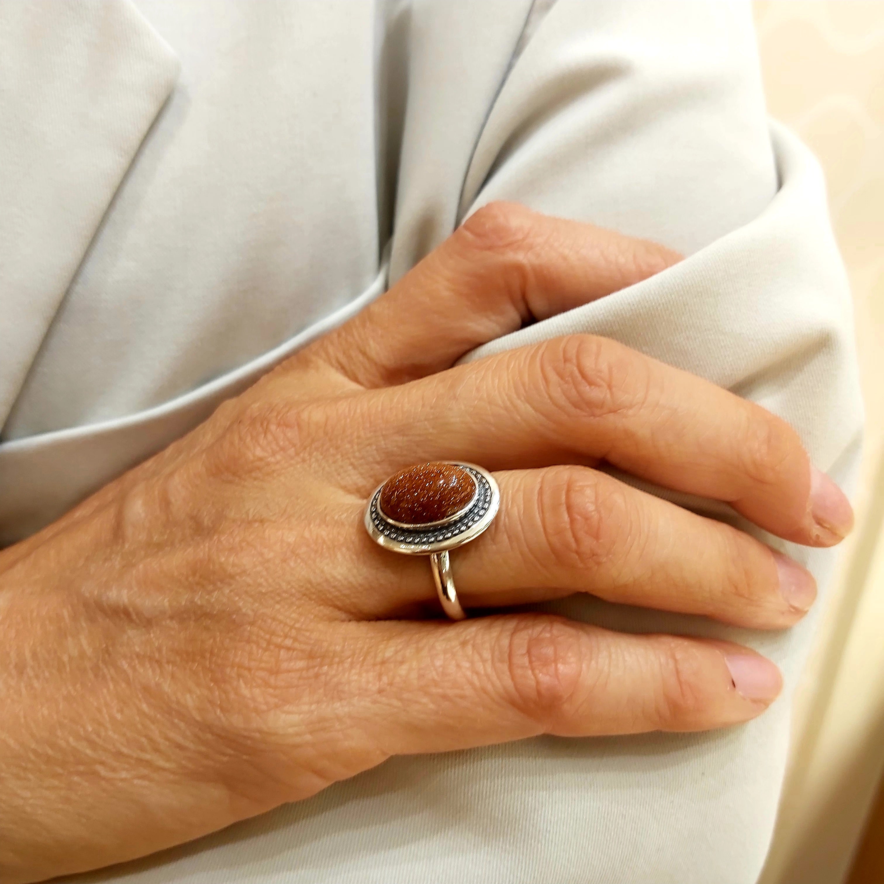 Pierścionek srebrny mały z kamieniem Piasek Pustyni w grawerowanej oprawie