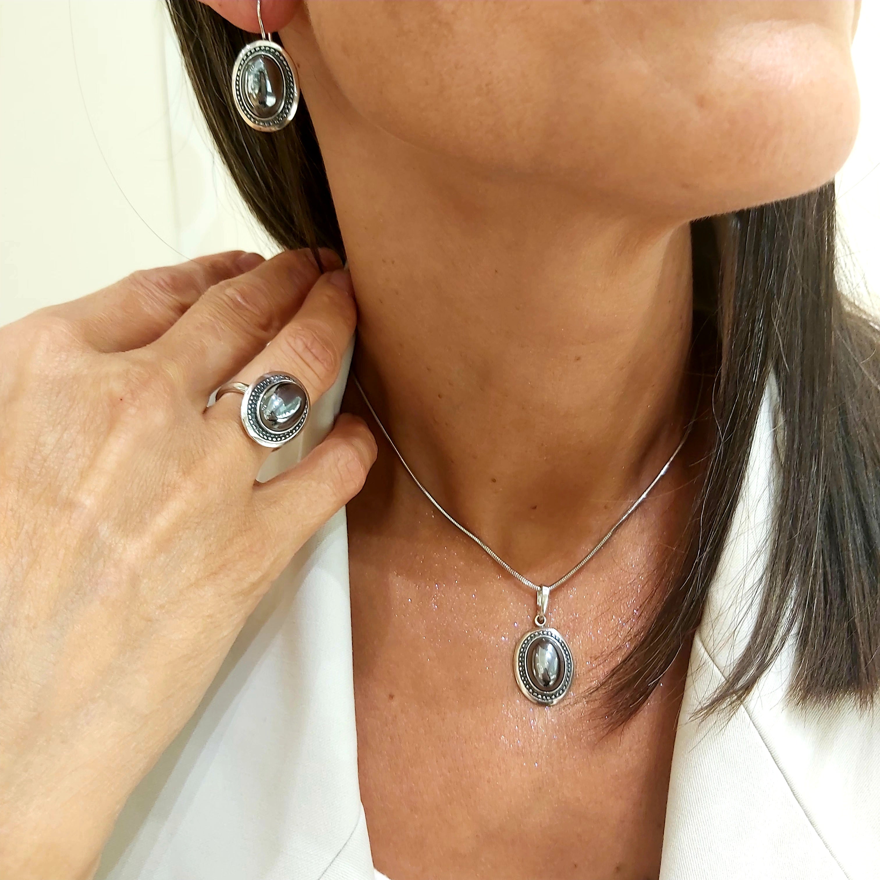 Zawieszka srebrna mała z hematytem w grawerowanej oprawie