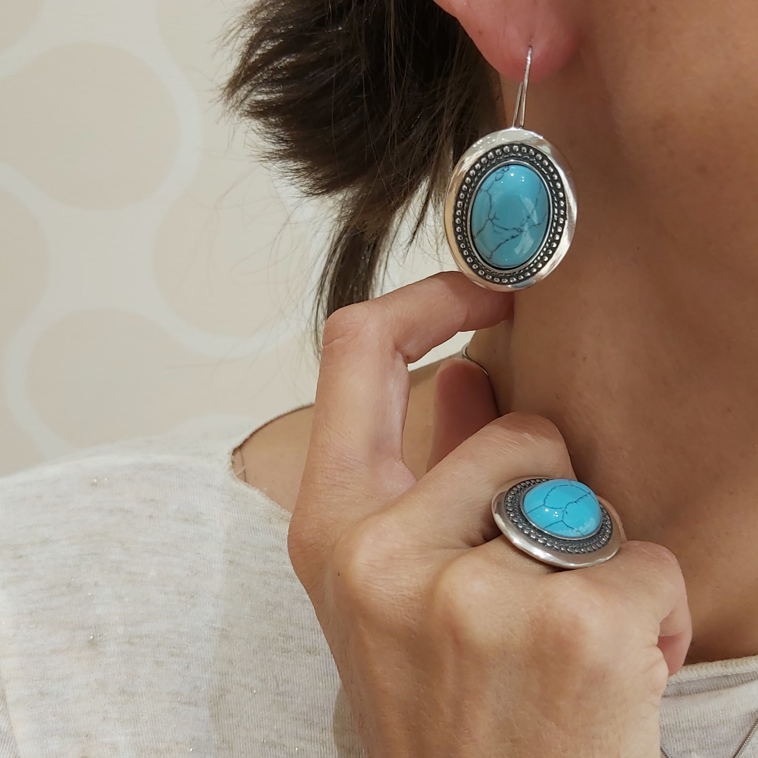 Duże kolczyki srebrne wiszące z turkusem w grawerowanej oprawie