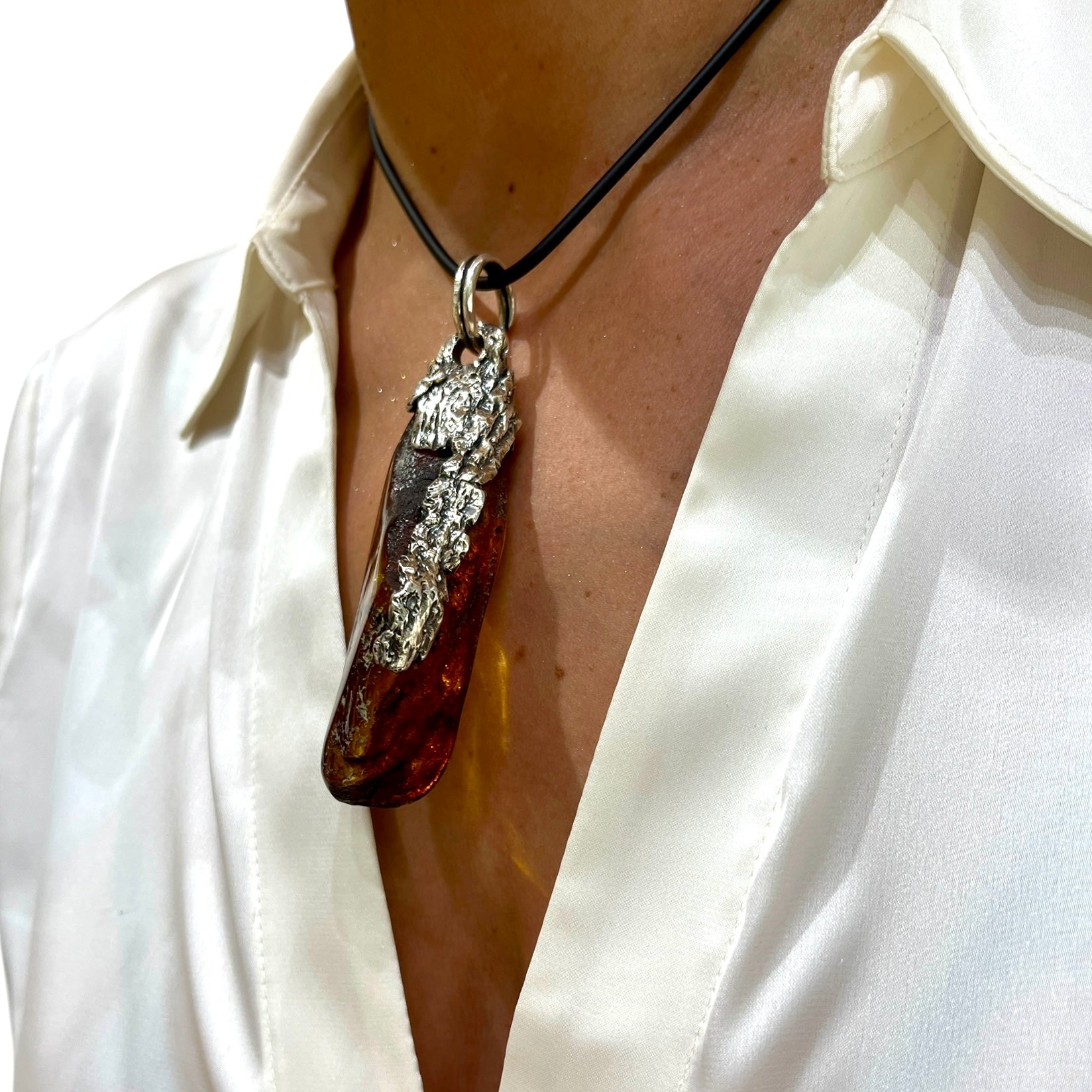 Srebrna zawieszka z dużym żółtym bursztynem w oksydowanej artystycznej oprawie