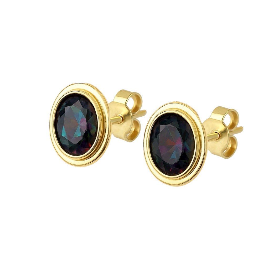 Złote kolczyki w gładkiej oprawie z owalnym topaz mystic
