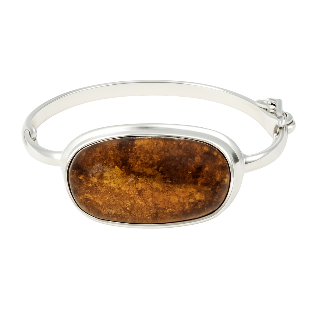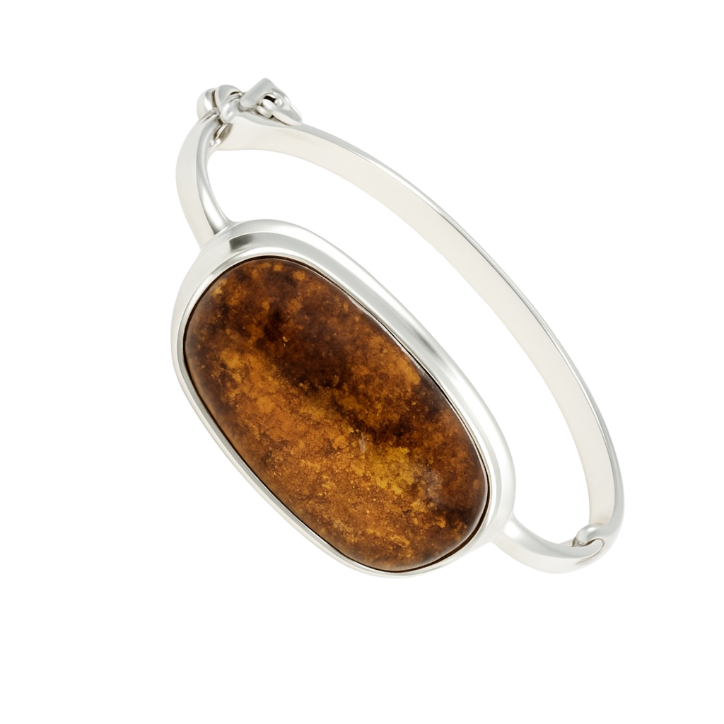 Srebrna bransoletka sztywna z owalnym brązowym bursztynem