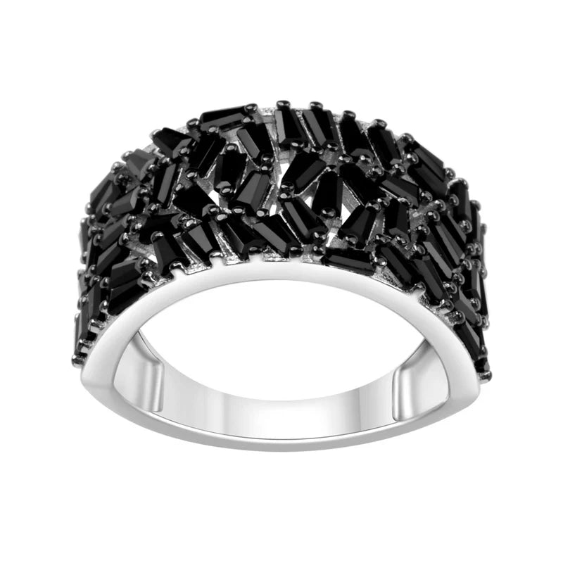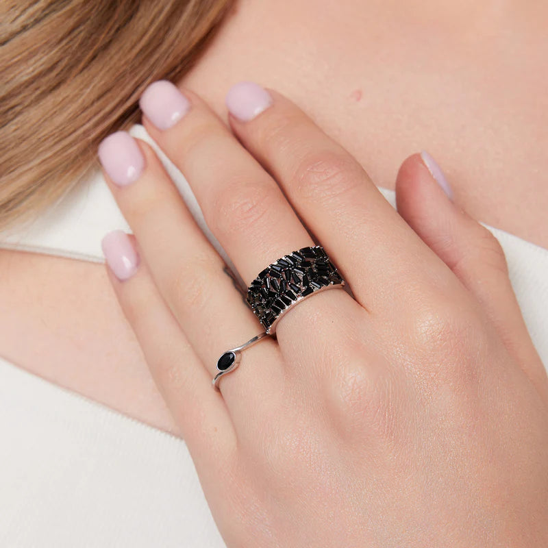 Pierścionek srebrny szeroki obrączkowy z czarnymi cyrkoniami