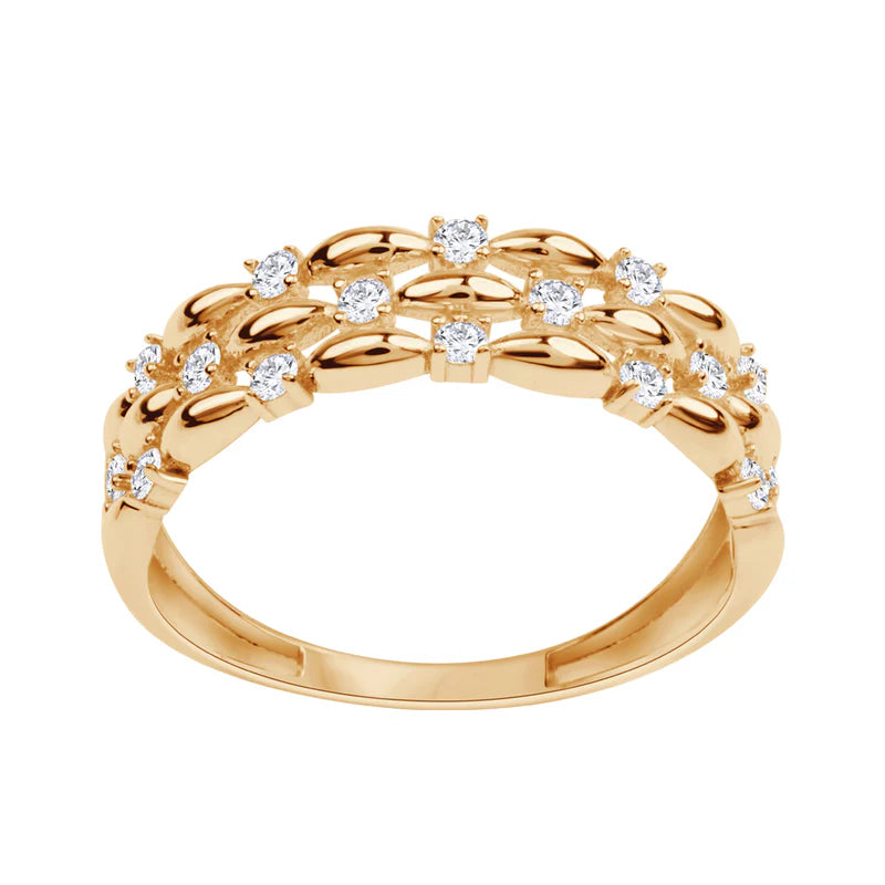 Złoty pierścionek z misterną plecionką i cyrkoniami
