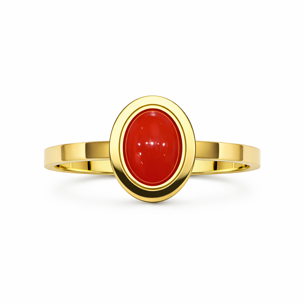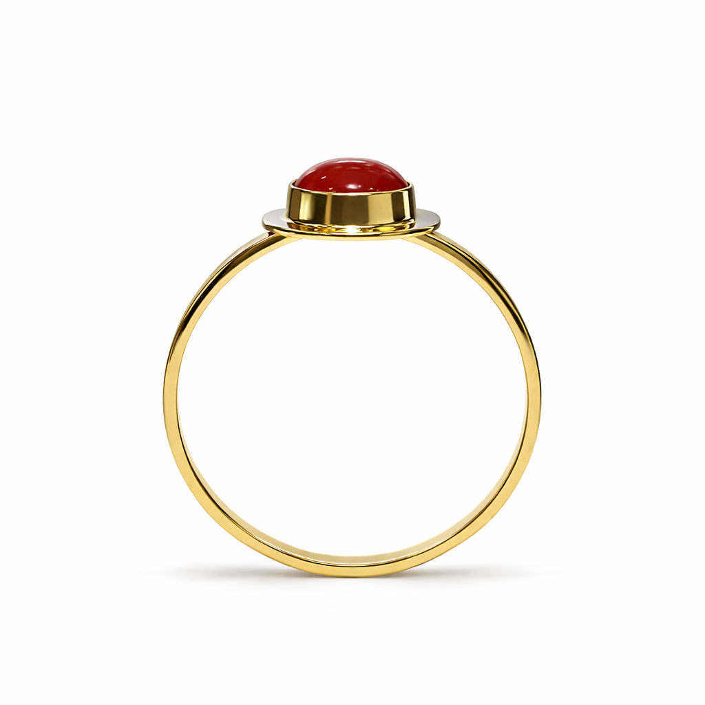 Złoty pierścionek w klasycznej gładkiej oprawie z koralem