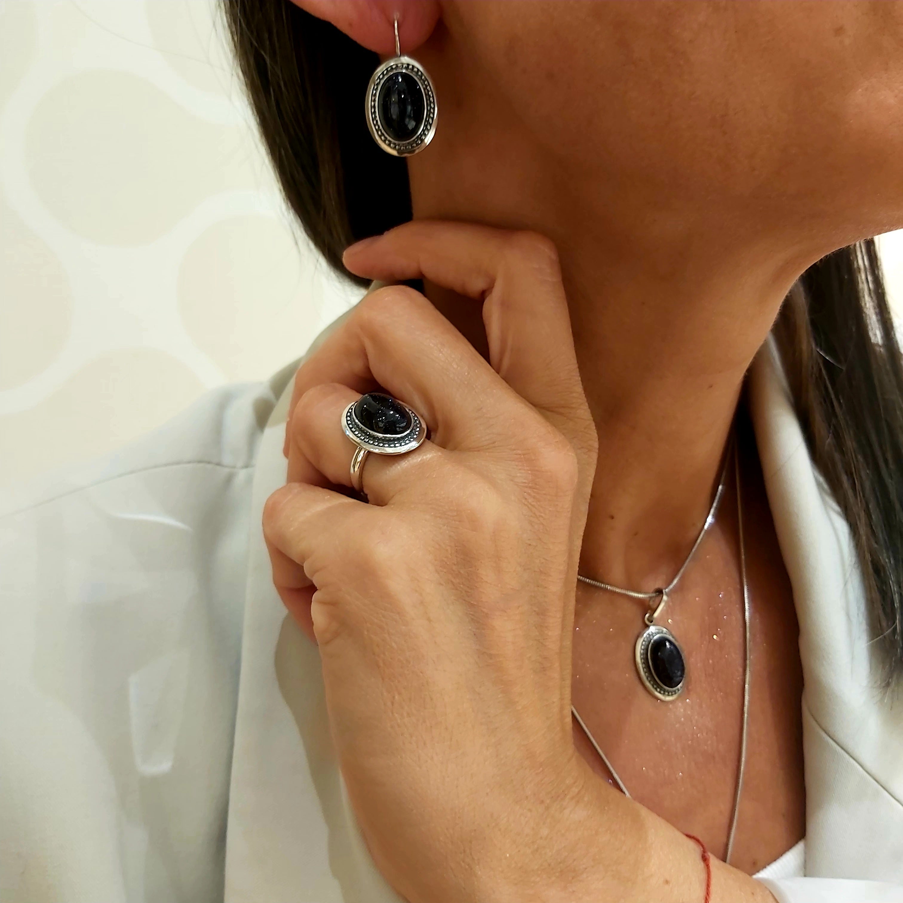 Pierścionek srebrny duży z kamieniem Noc Kairu w garwerowanej oprawie