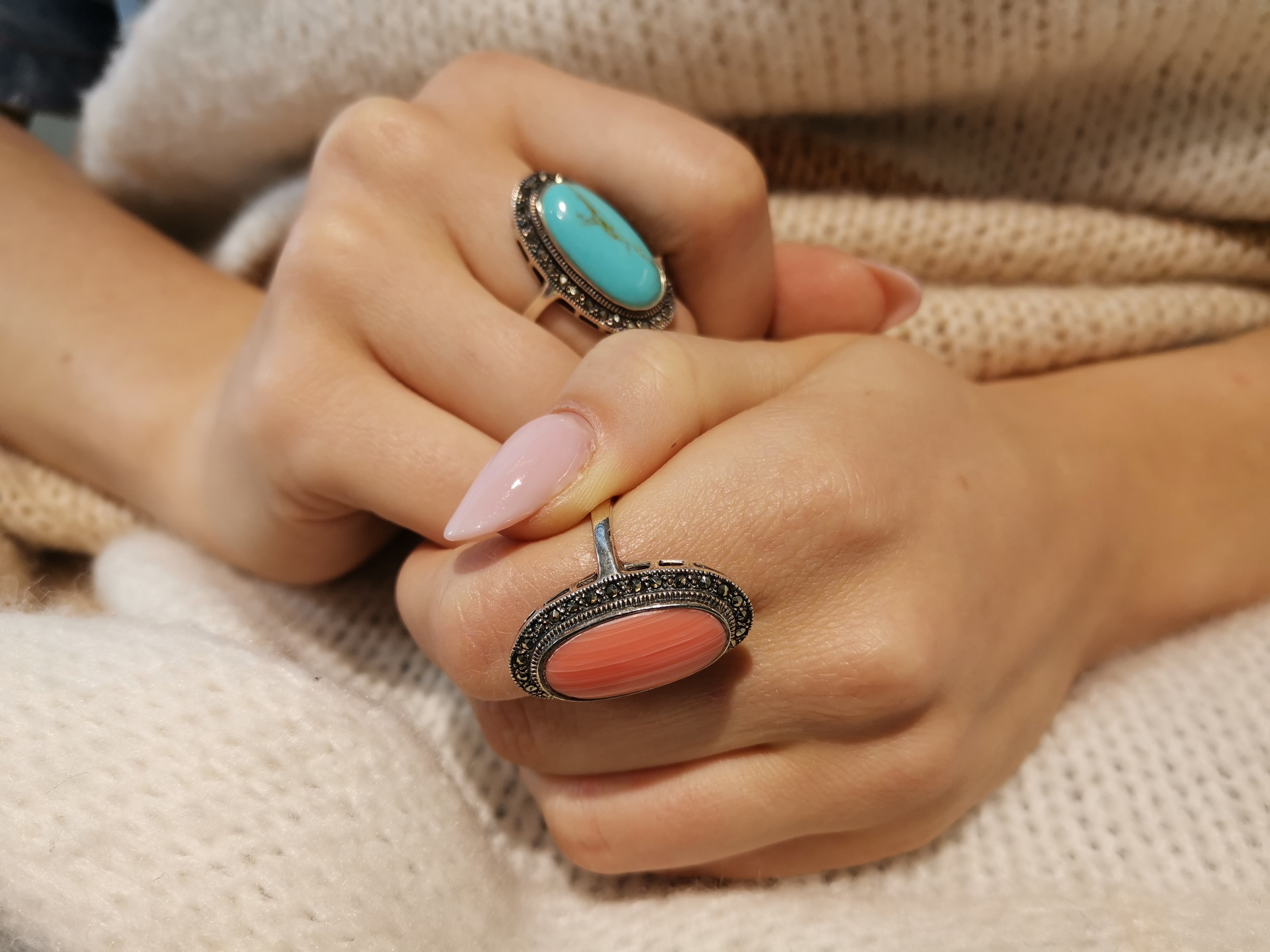 Pierścionek srebrny z turkusem w ażurowej oksydowanej oprawie