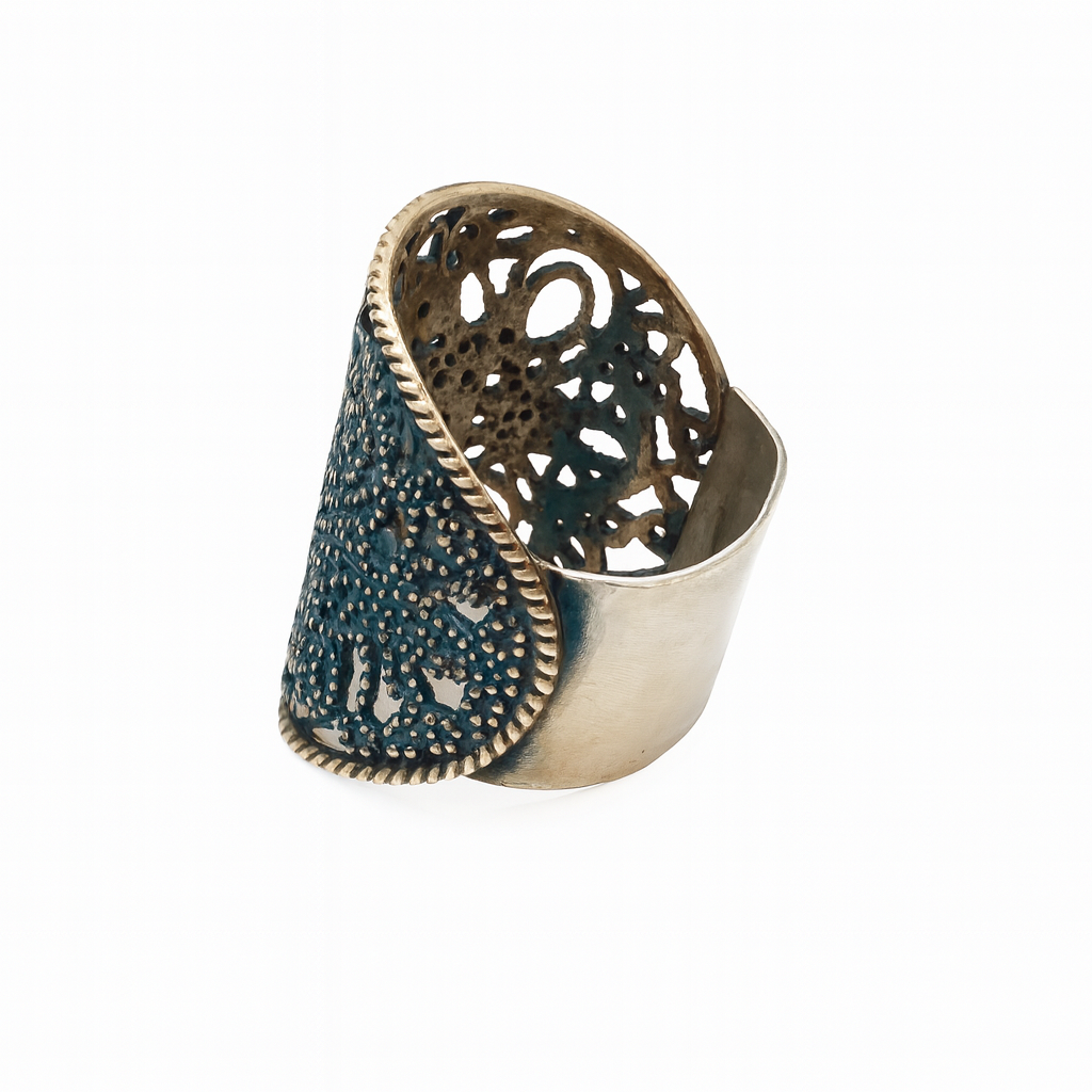 Szeroki pierścionek srebrny pozłacany ażurowy okrągły