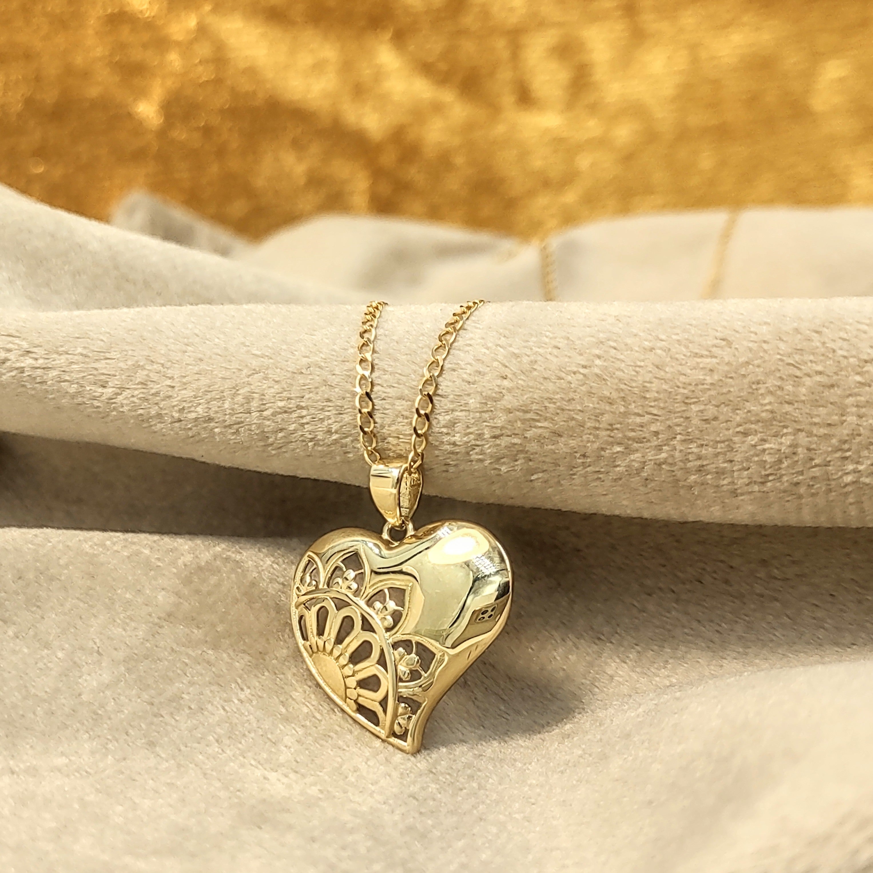 Przepiękna ażurowa zawieszka w kształcie serca, wykonana ze złota. Misterny wzór nadaje jej wyjątkowy charakter i lekkość, dzięki czemu przyciąga wzrok i subtelnie podkreśla dekolt. Idealna jako wyraz miłości, prezent na wyjątkową okazję lub dodatek do ulubionego łańcuszka. Zawieszka łączy w sobie klasykę i nowoczesny design, doskonale pasując do każdej stylizacji – od codziennych po bardziej eleganckie.