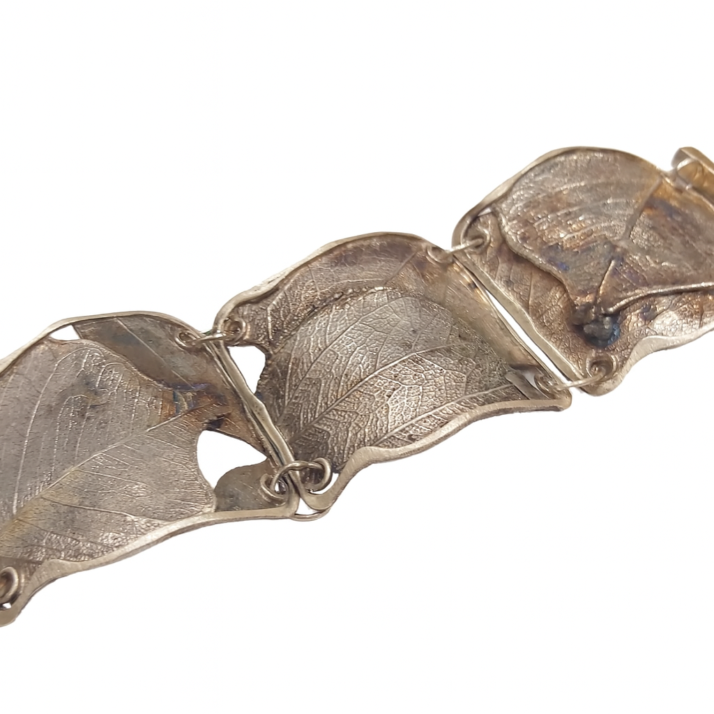 To wyjątkowa bransoletka wykonana z ręcznie obrobionego srebra i miedzi. Praca nosi cechy artystycznego stylu, widoczne są unikalne detale liście, które zostały dokładnie odwzorowane, uwidaczniając naturalną teksturę i żyłkowanie. Kolorystyka z odcieniami tęczy wskazuje na zastosowanie techniki patynowania, co nadaje jej niepowtarzalny charakter.