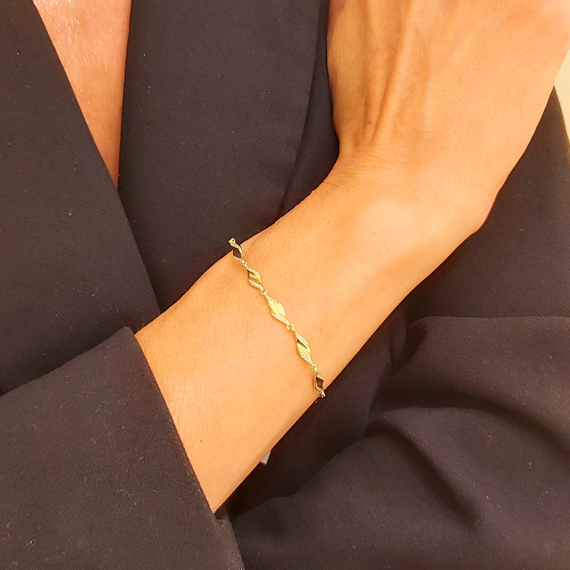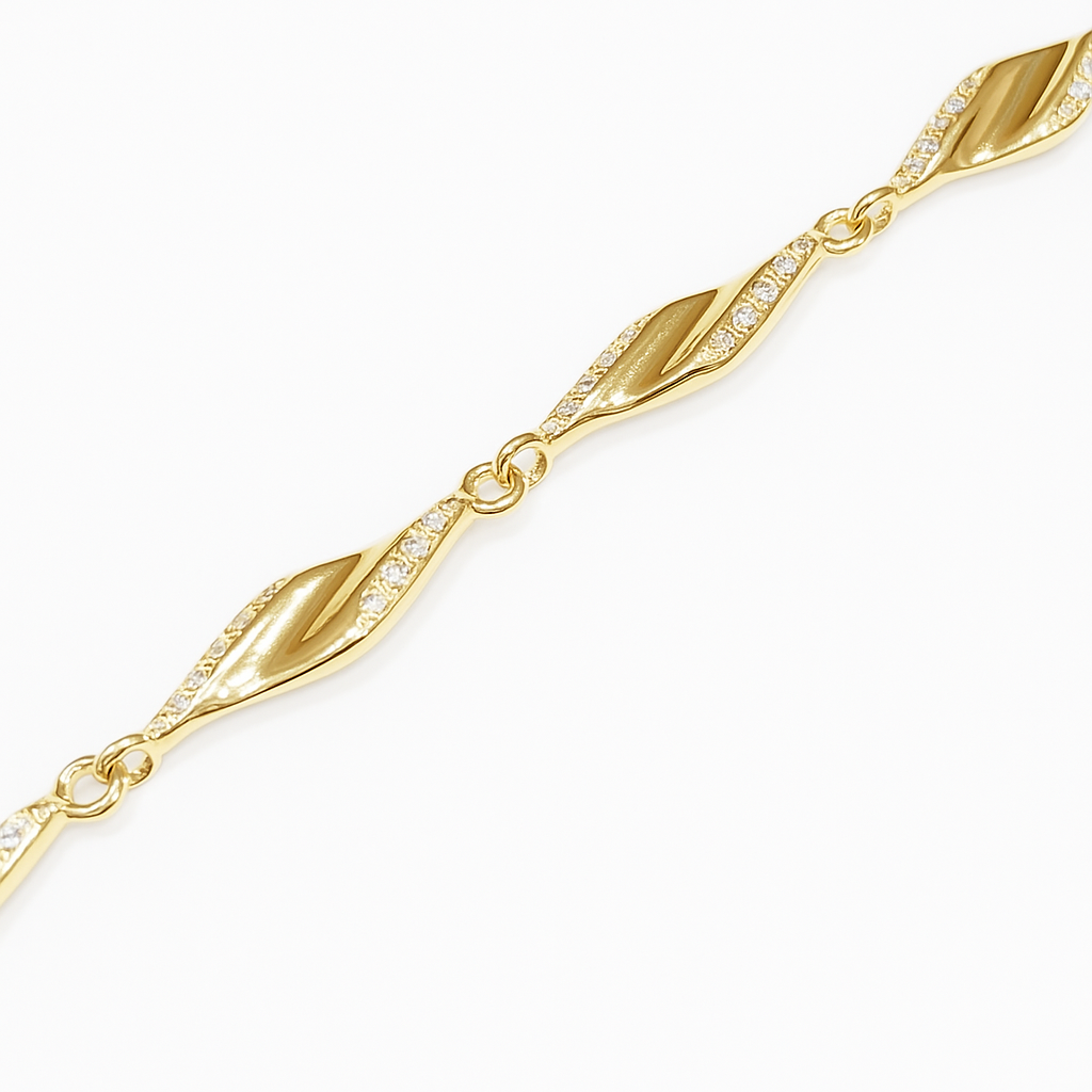 Bransoletka z falowanych elementów ozdobiona cyrkoniami została wykonana ze złoconego srebra próby 925.