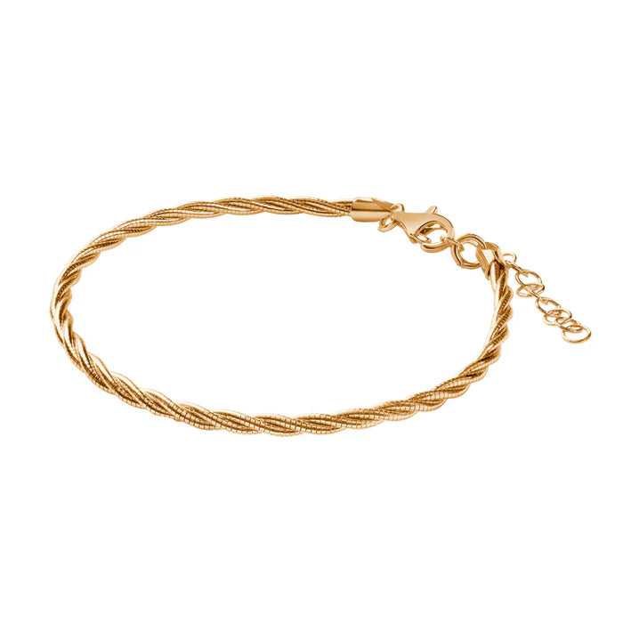Na zdjęciu widoczny jest bransoletka srebrna pozłacana, która ma formę sztywnej, skręconej obręczy o eleganckim i klasycznym wyglądzie. Jej struktura przypomina skręcony sznur, co nadaje jej delikatny, ale jednocześnie wyrazisty charakter. Może być noszona samodzielnie jako subtelna ozdoba lub zestawiona z innymi dodatkami dla bardziej efektownego wyglądu.