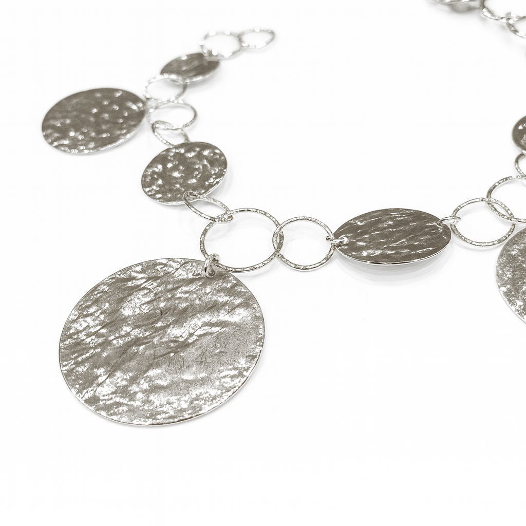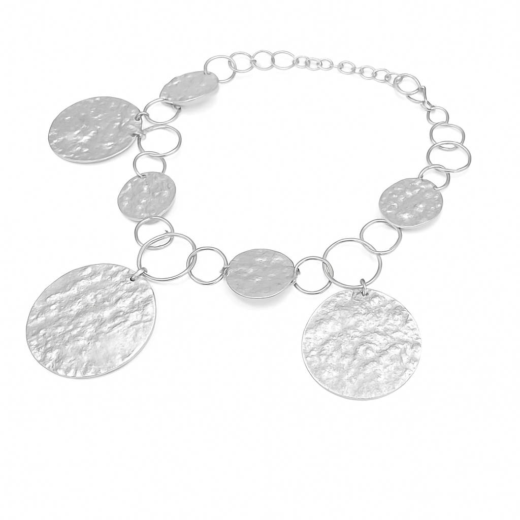 Bransoletka z elementami ozdobnymi w kształcie  młotkowanych blaszek, wykonana ze srebra próby 925. Długość regulowana 19-21 cm.