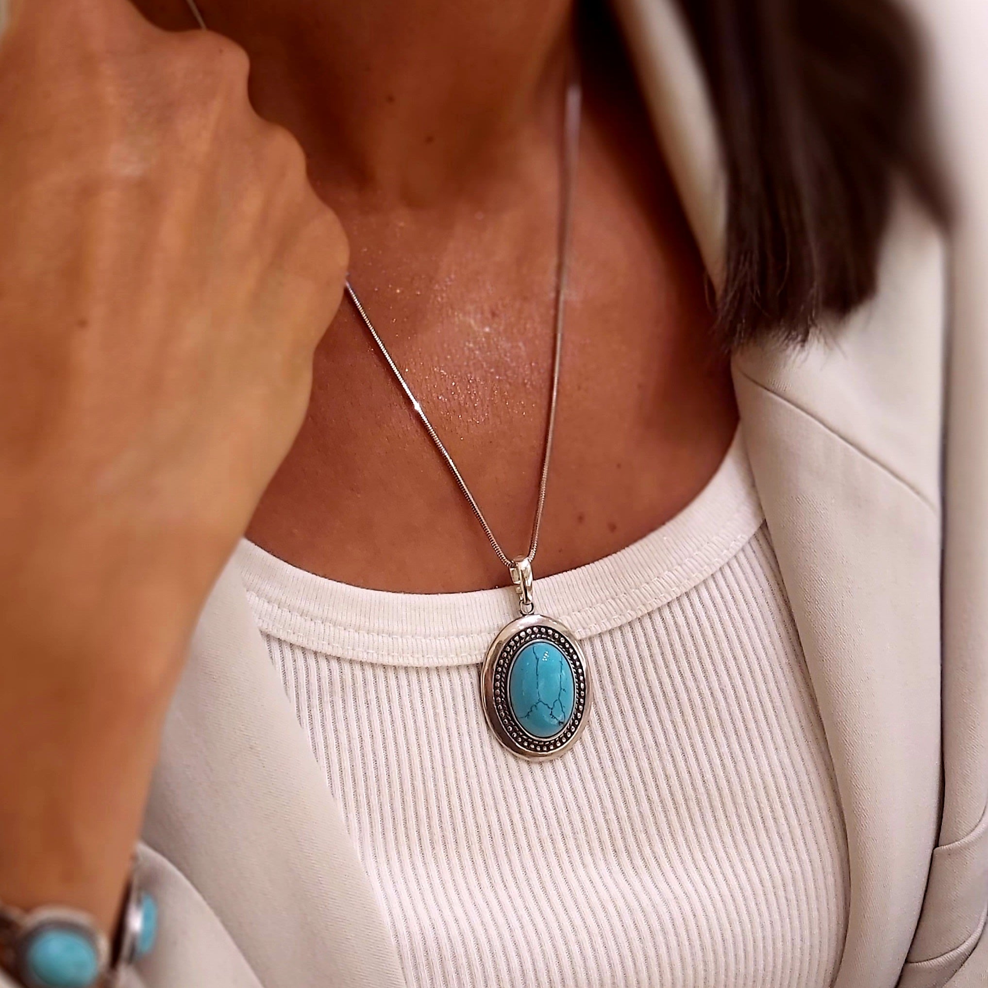 Piękna srebrna bransoletka z naturalnym turkusem. Wykonana z najwyższej jakości srebra, zdobiona sześcioma dużymi, owalnymi kamieniami turkusowymi o unikalnym wyglądzie. Turkus symbolizuje szczęście i ochronę, a jego niepowtarzalna barwa sprawia, że bransoletka przyciąga wzrok i dodaje elegancji każdej stylizacji.