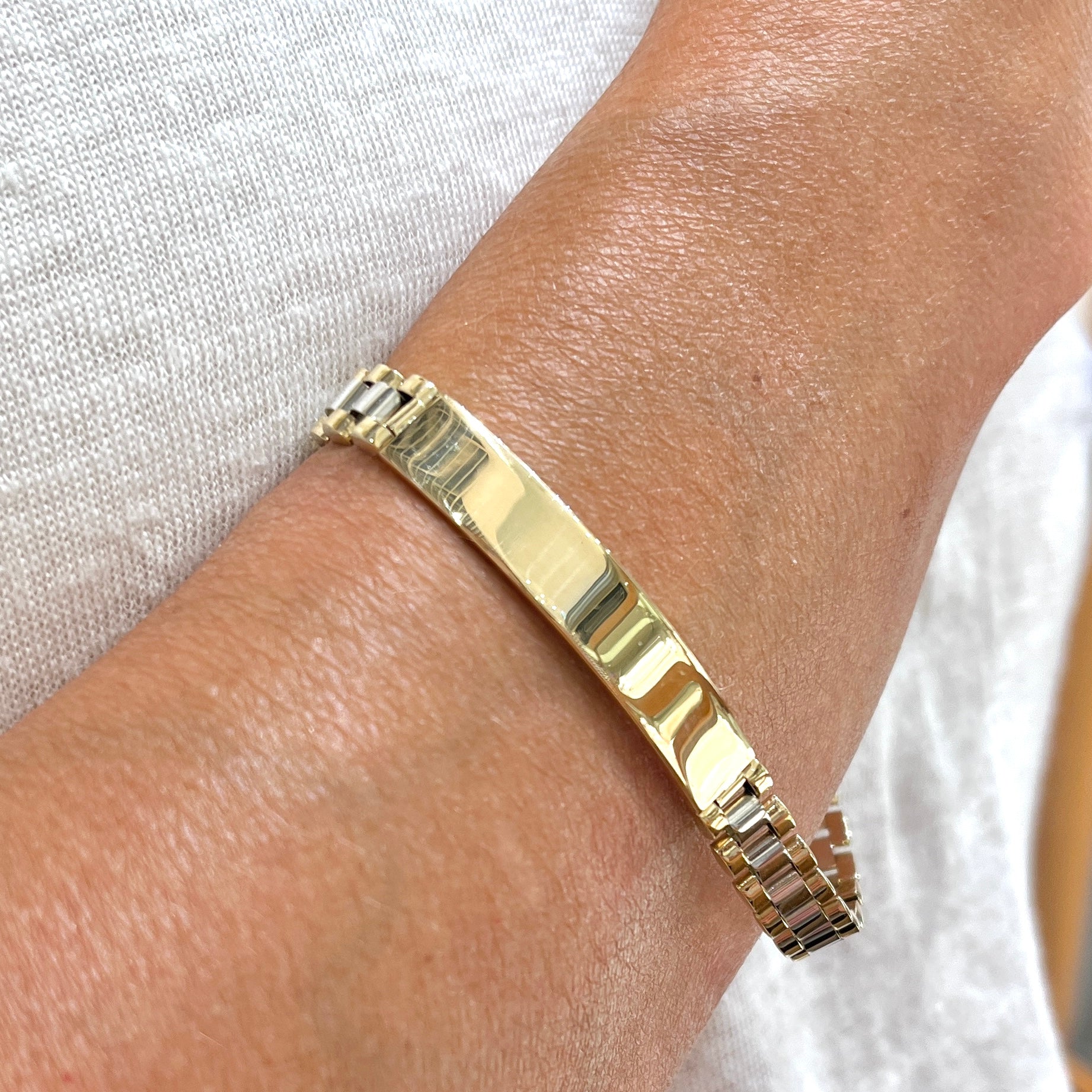 Bransoletka z blaszką wykonana z dwukolorowego złota białego i żółtego próby 375.
