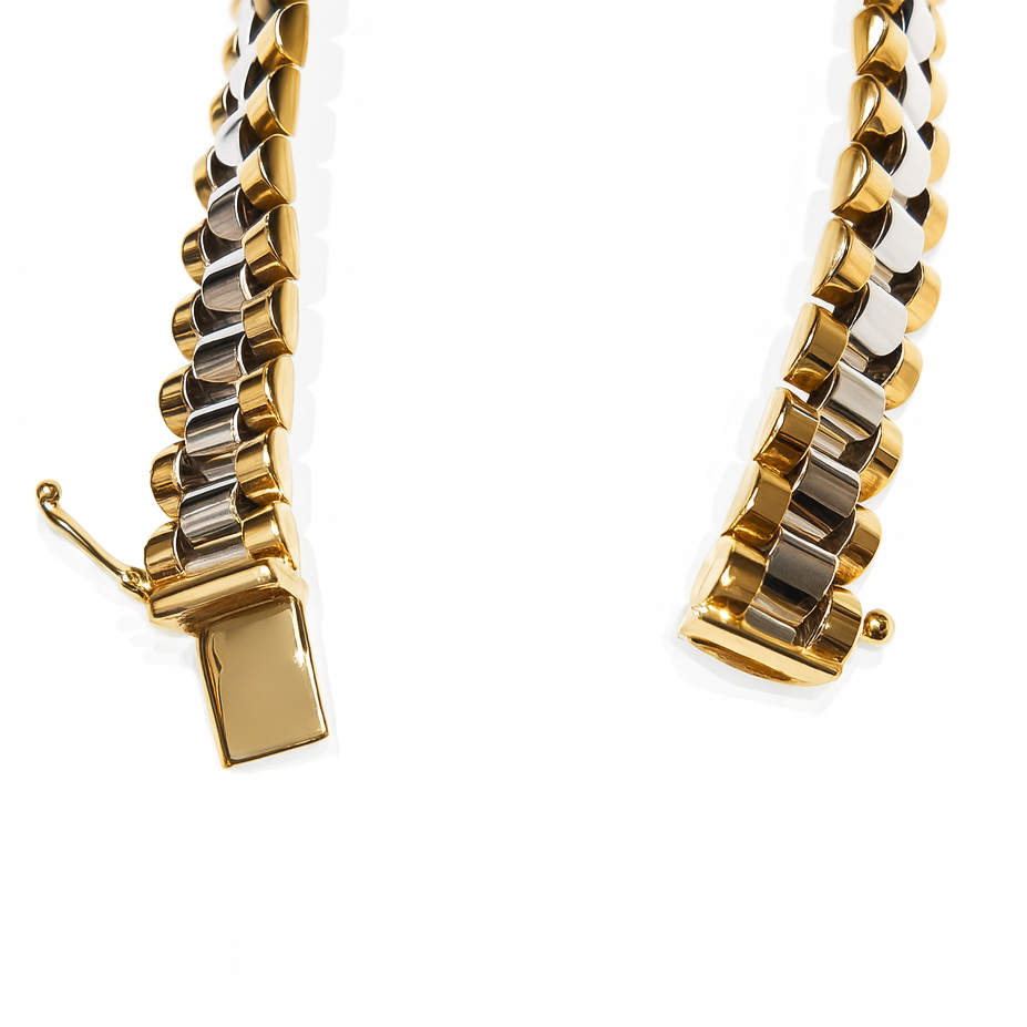 Odkryj prawdziwą esencję elegancji z naszą bransoletką o wzorze inspirowanym legendarnym stylem. Wykonana z dwukolorowego złota próby 375, ta bransoletka zachwyca precyzyjnym wzorem ogniw oraz błyszczącą blaszką na środku, która dodaje jej wyjątkowego charakteru. To doskonały wybór dla osób ceniących klasyczne wzornictwo z nutą luksusu. Idealna do noszenia na co dzień, jak i na specjalne okazje, ta bransoletka nie tylko podkreśli Twój styl, ale także przyciągnie spojrzenia. Blaszka idealnie nadaje się do grawerunku. Ten splot składa się z naprzemiennych, prostokątnych ogniw, które tworzą elegancki, ale solidny wzór.