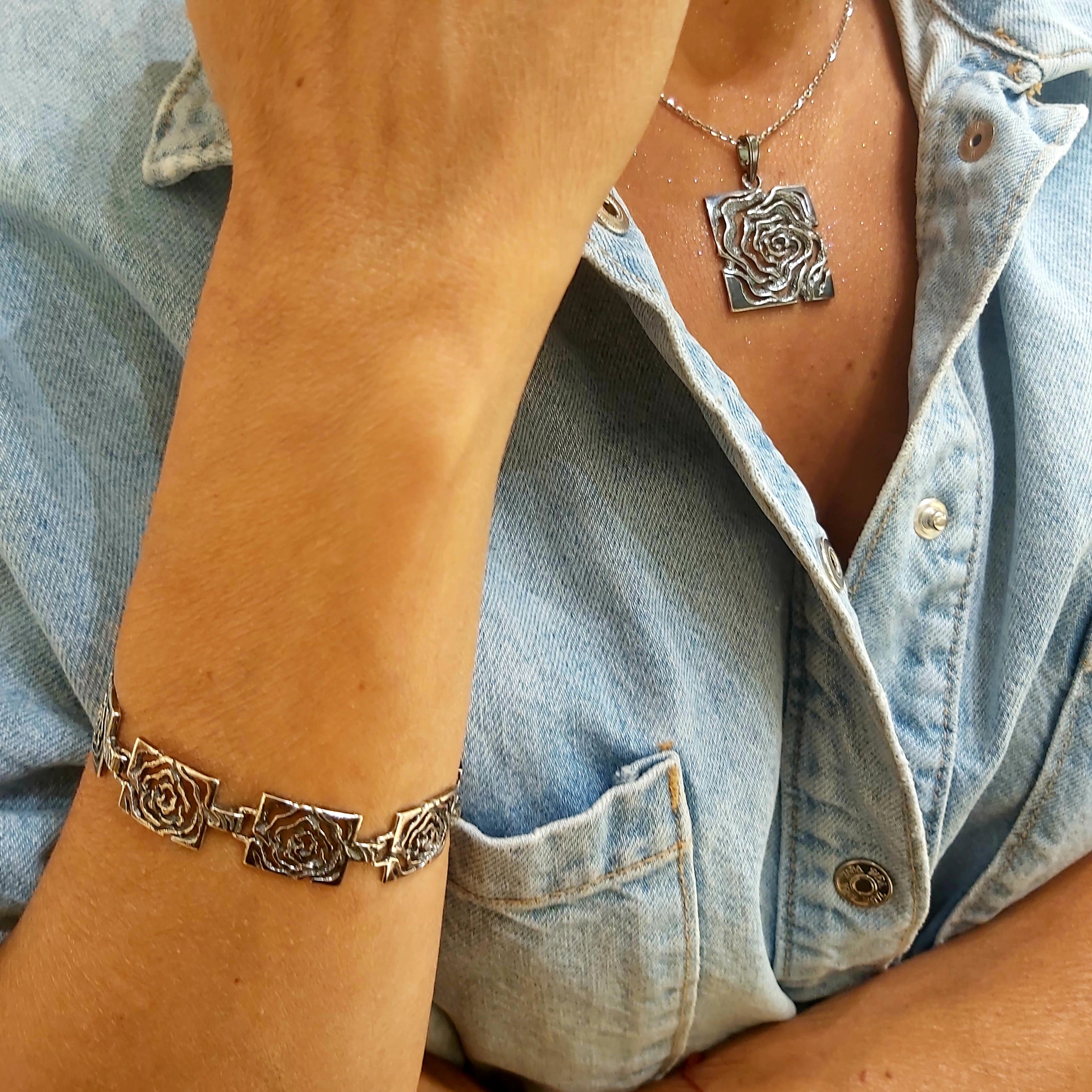 Bransoletka z ogniwkami z motywem róży, wykonana z oksydowanego srebra próby 925.