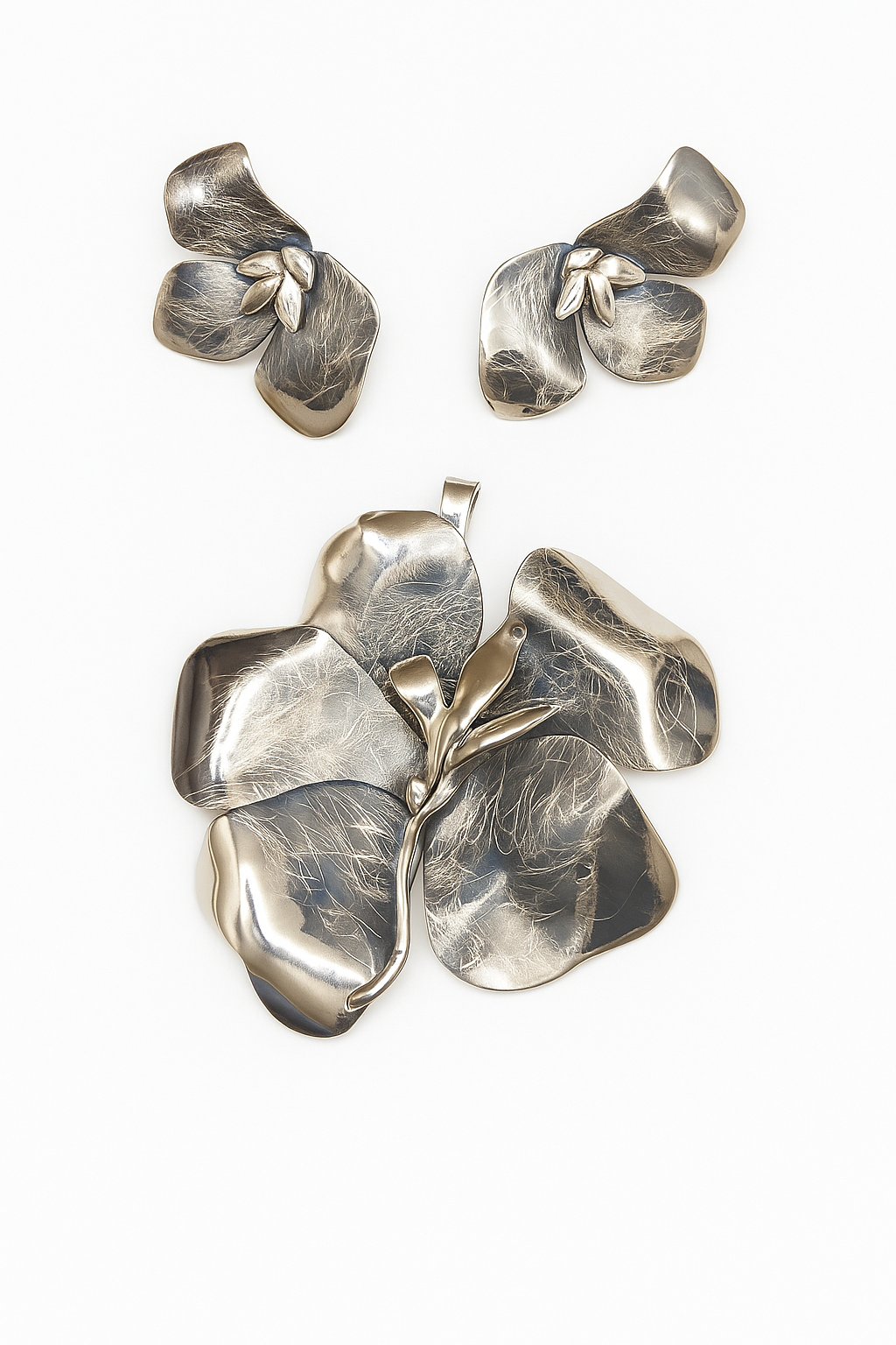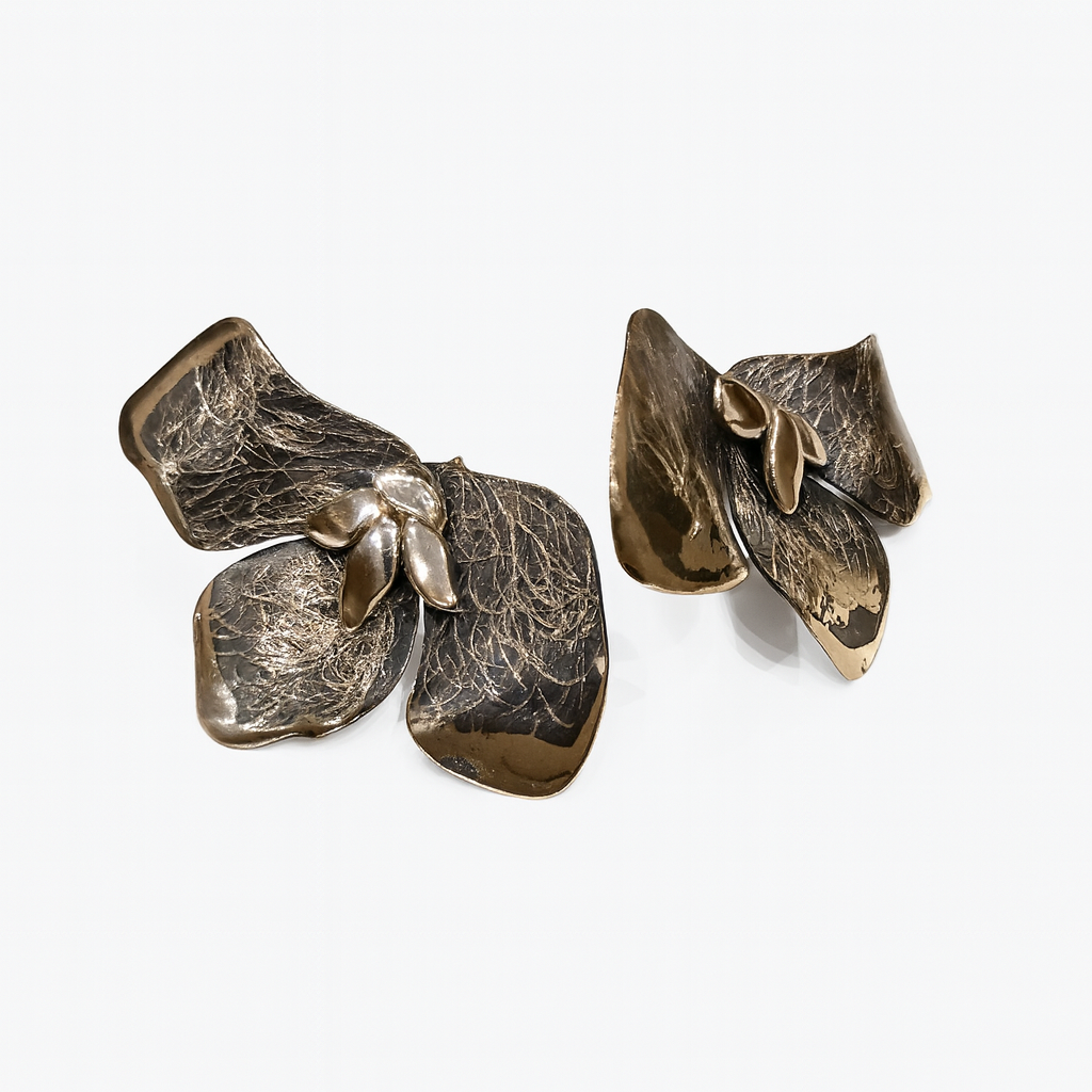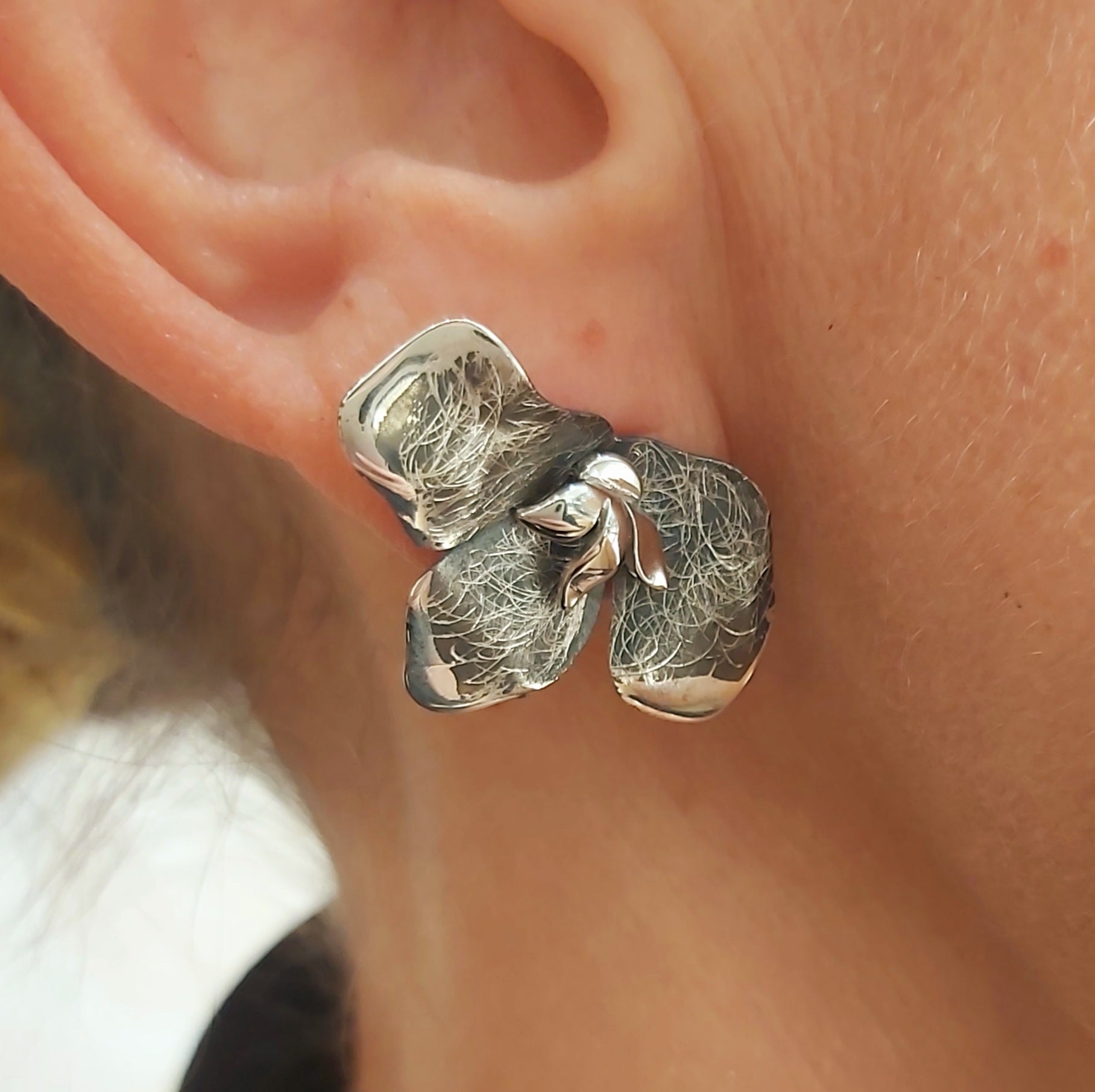 Eleganckie kolczyki w kształcie kwiatów orchidei wykonane ze srebra próby 925. Ręcznie fakturowane i oksydowane płatki nadają biżuterii wyjątkowego charakteru vintage, a delikatne detale w centrum podkreślają naturalne piękno roślinnych motywów. Kolczyki zapinane są na wygodne sztyfty, dzięki czemu dobrze trzymają się na uchu. Idealne dla kobiet, które lubią oryginalną biżuterię artystyczną i chcą wyróżnić się subtelną elegancją.
