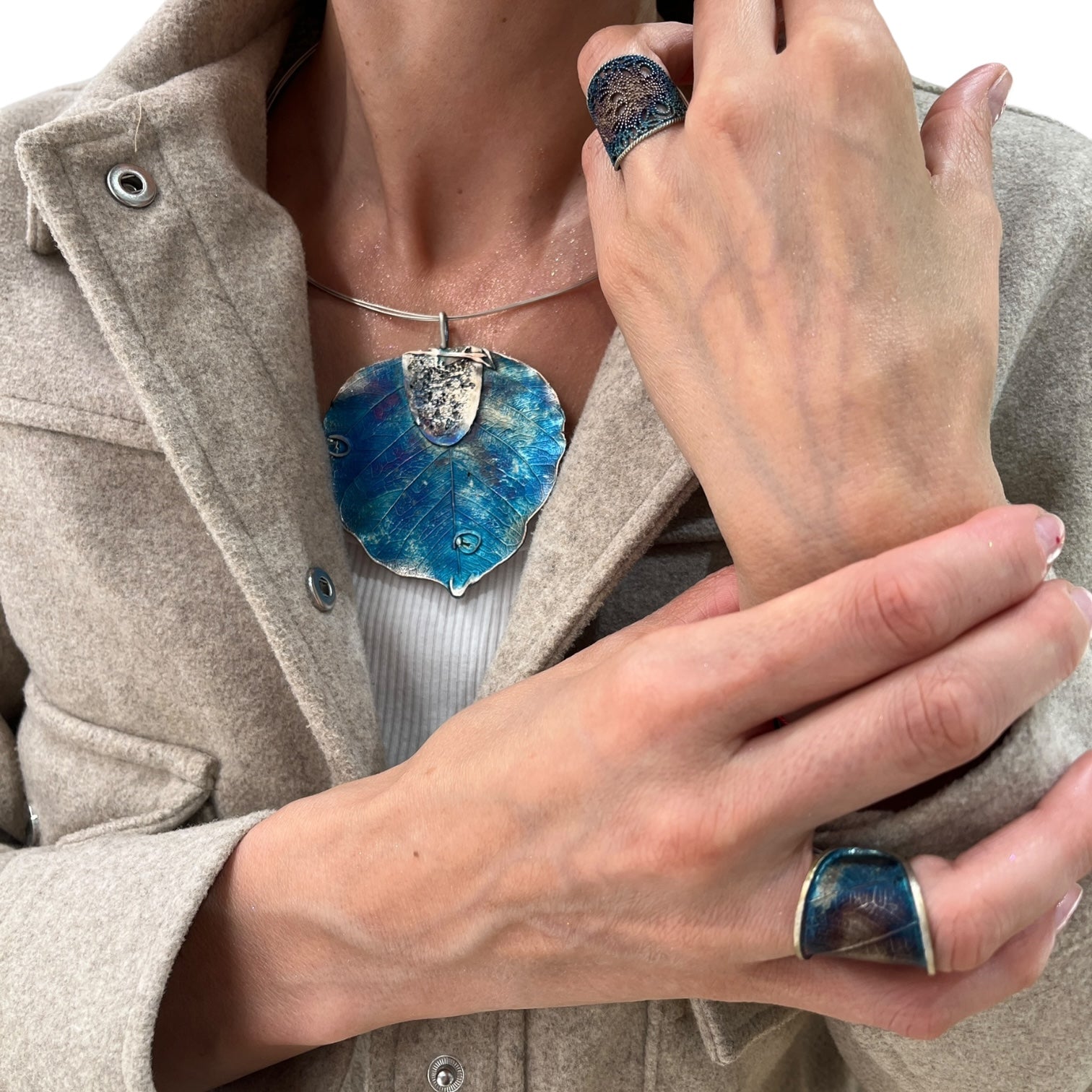 Unikatowy naszyjnik artystyczny wykonany ze srebra, ozdobiony metodą galwanizacji, która nadaje mu intensywne odcienie błękitu, fioletu i złota. Centralnym elementem kompozycji jest liść – realistycznie odwzorowany z zachowaniem najdrobniejszych żyłek, co nadaje biżuterii naturalny, organiczny charakter.