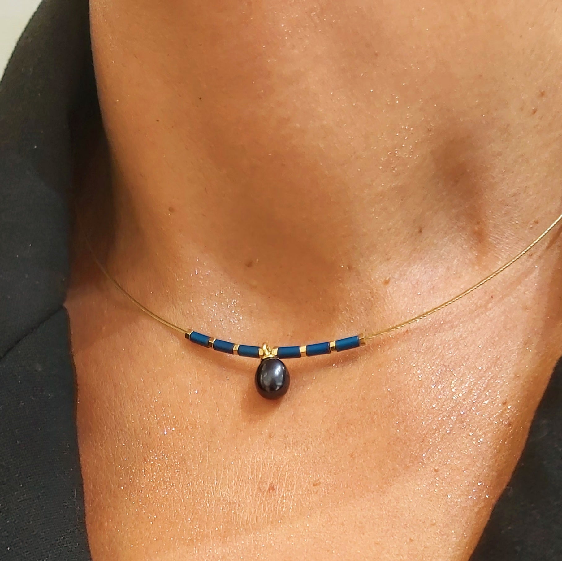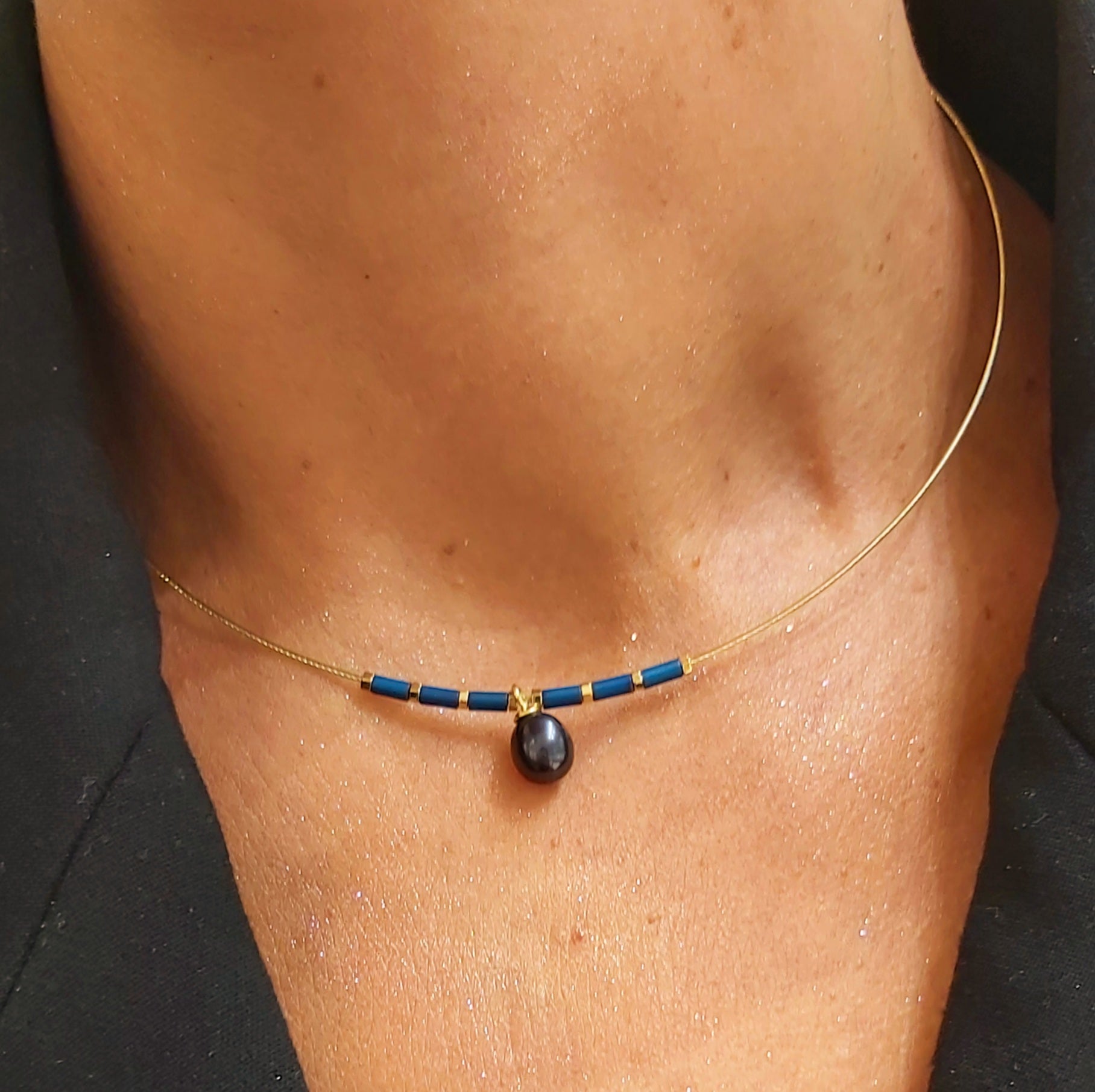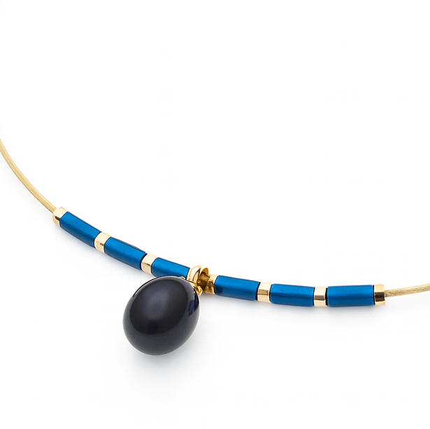 Elegancki naszyjnik wykonany ze srebra pozłacanego, ozdobiony naturalną perłą w ciemnym odcieniu. Delikatna forma z akcentem złocenia i niebieskimi elementami sprawia, że biżuteria prezentuje się nowocześnie i szykownie. Idealny wybór na wyjątkowe okazje oraz do codziennych stylizacji, kiedy chcesz podkreślić swój styl subtelną, a zarazem wyrazistą ozdobą.