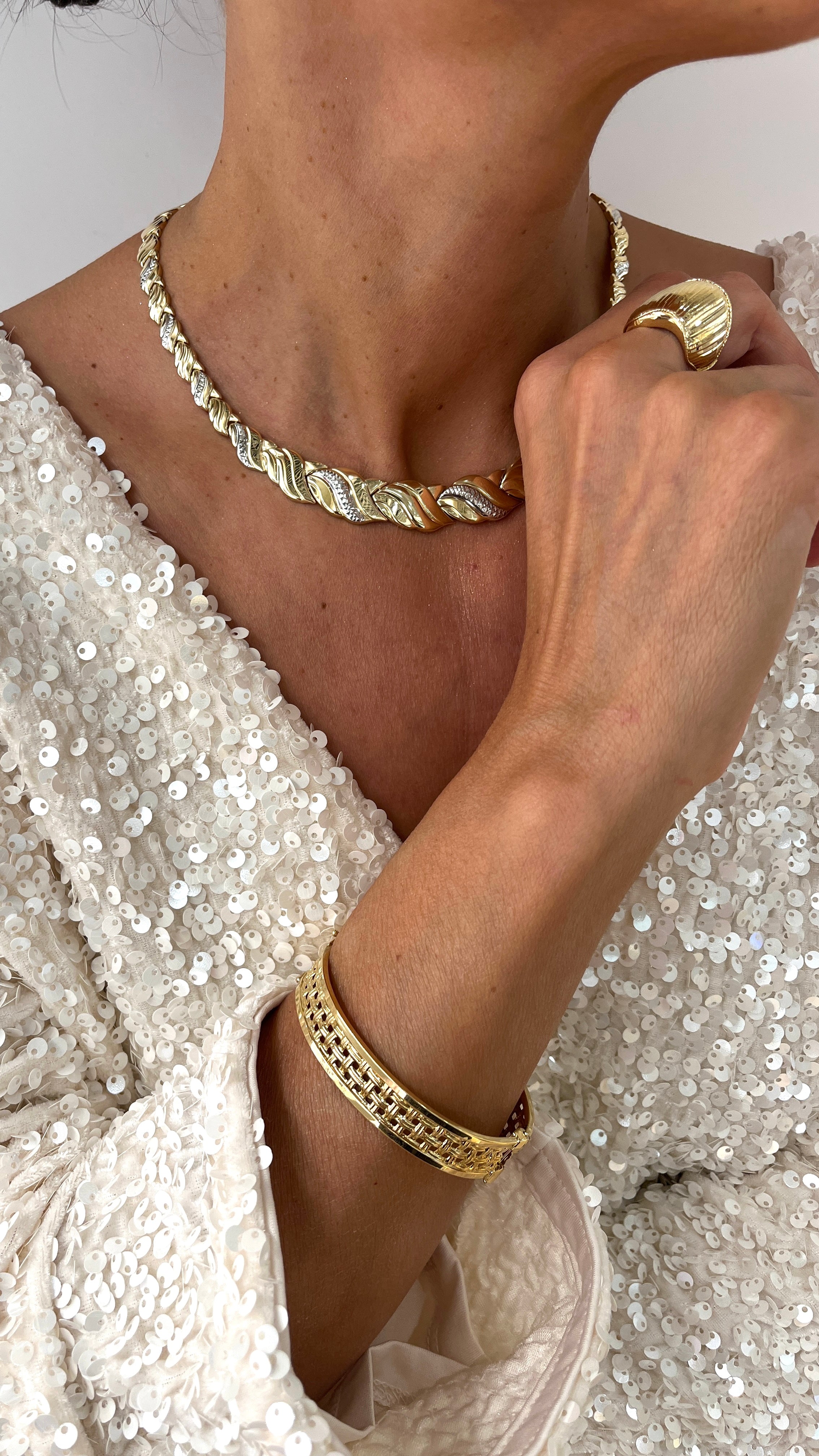 Elegancka kolia wykonana z żółtego złota próby 585, o wyjątkowym splocie przypominającym delikatne liście. Jej powierzchnia łączy połyskliwe, gładkie elementy z subtelnymi zdobieniami w białym złocie, które pięknie odbijają światło i dodają całości luksusowego charakteru. Biżuteria idealna na wyjątkowe okazje – świetnie komponuje się z wieczorową suknią lub elegancką stylizacją.