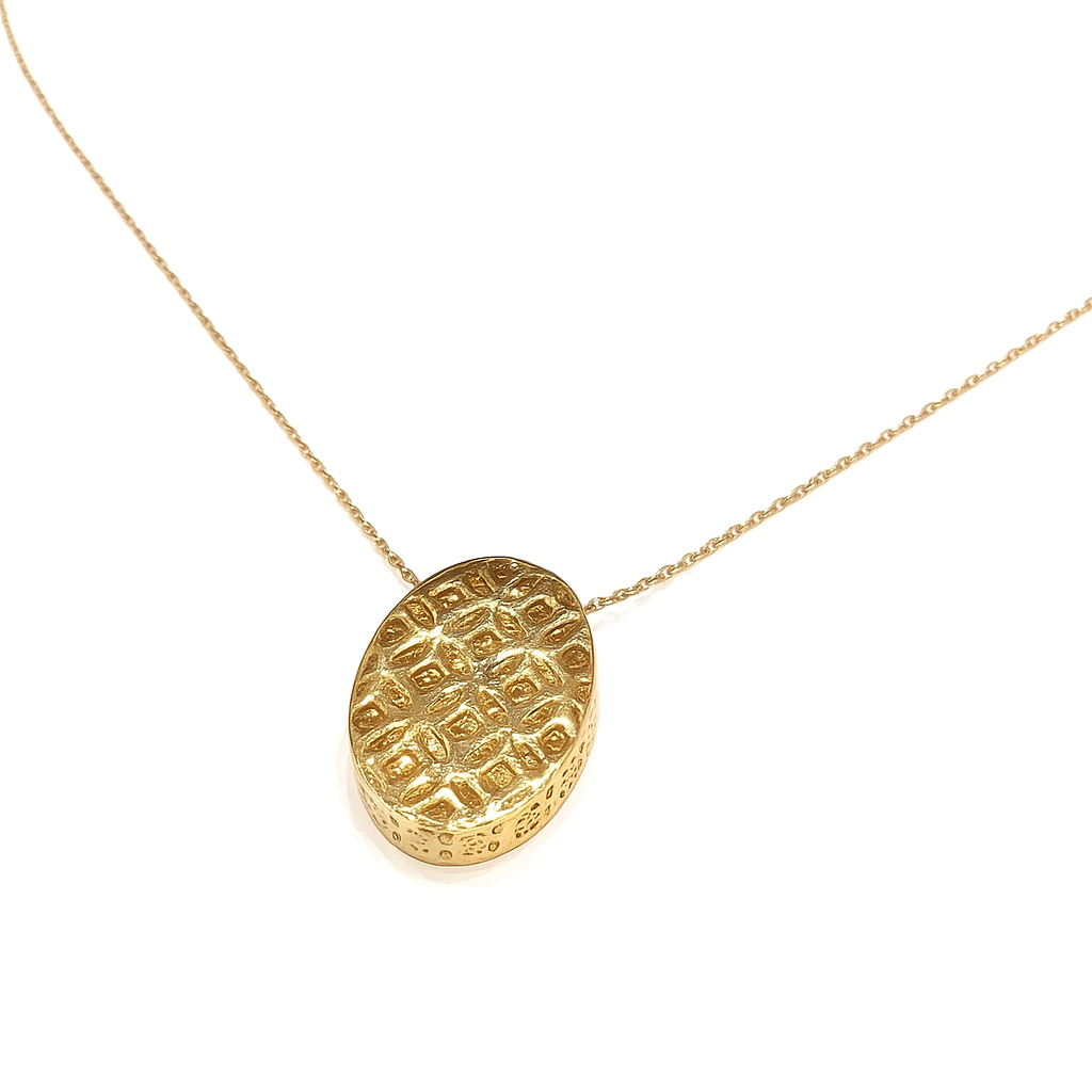 Złoty naszyjnik z elementem ozdobnym w kształcie ażurowego owalu, wykonany na łańcuszku o splocie ankier, w próbie 0,585.