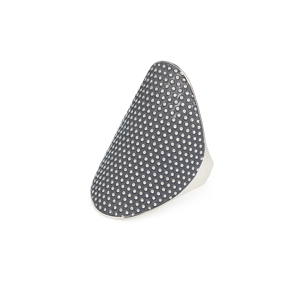 Wyjątkowy pierścionek wykonany ze srebra próby 925, ozdobiony oksydacją podkreślającą jego nowoczesny, geometryczny kształt. Faktura w postaci drobnych wypukłych punktów dodaje mu charakteru i oryginalności. Idealny wybór dla osób ceniących odważne, designerskie dodatki.