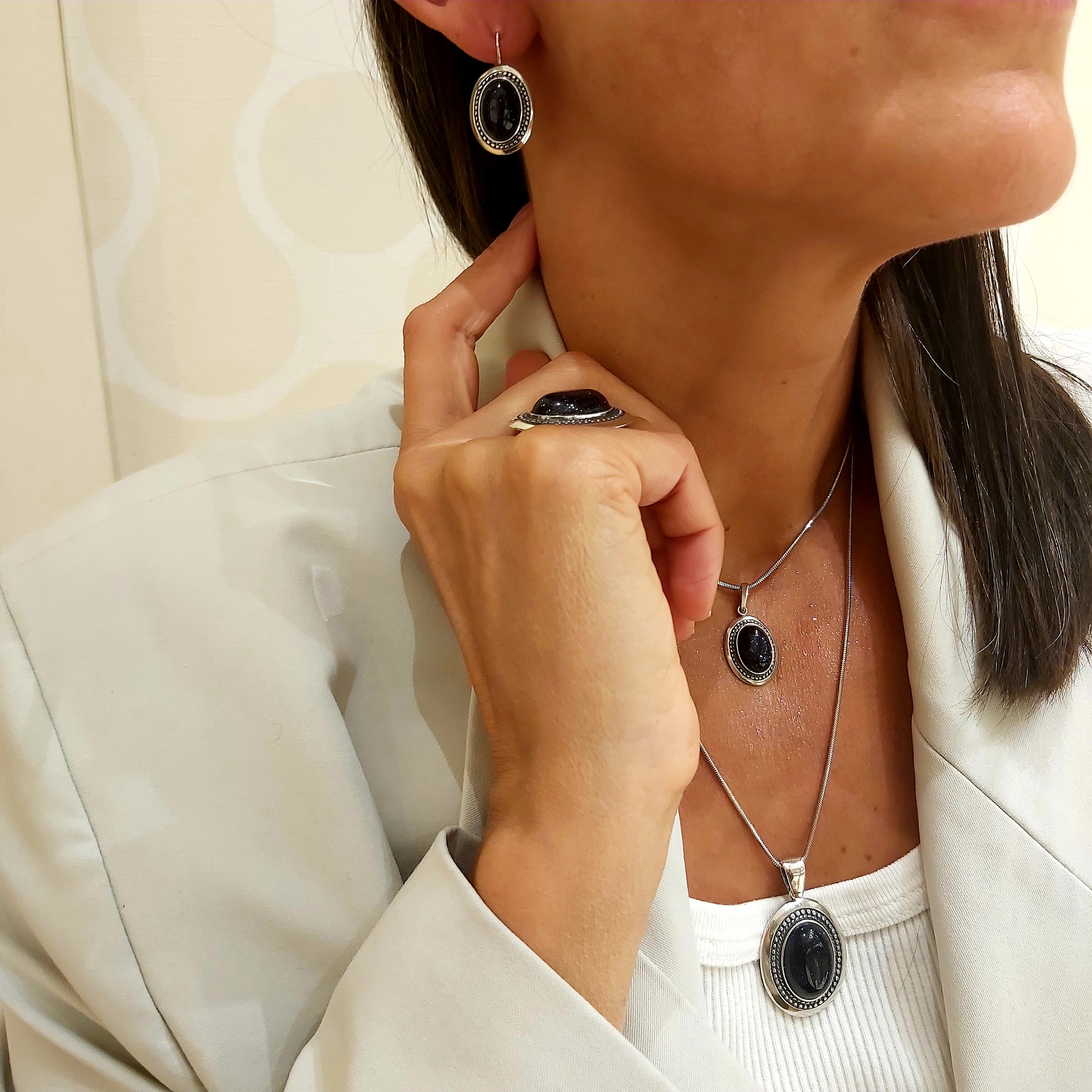 Pierścionek ozdobiony kamieniem Noc Kairu, wykonany ze srebra próby 925.