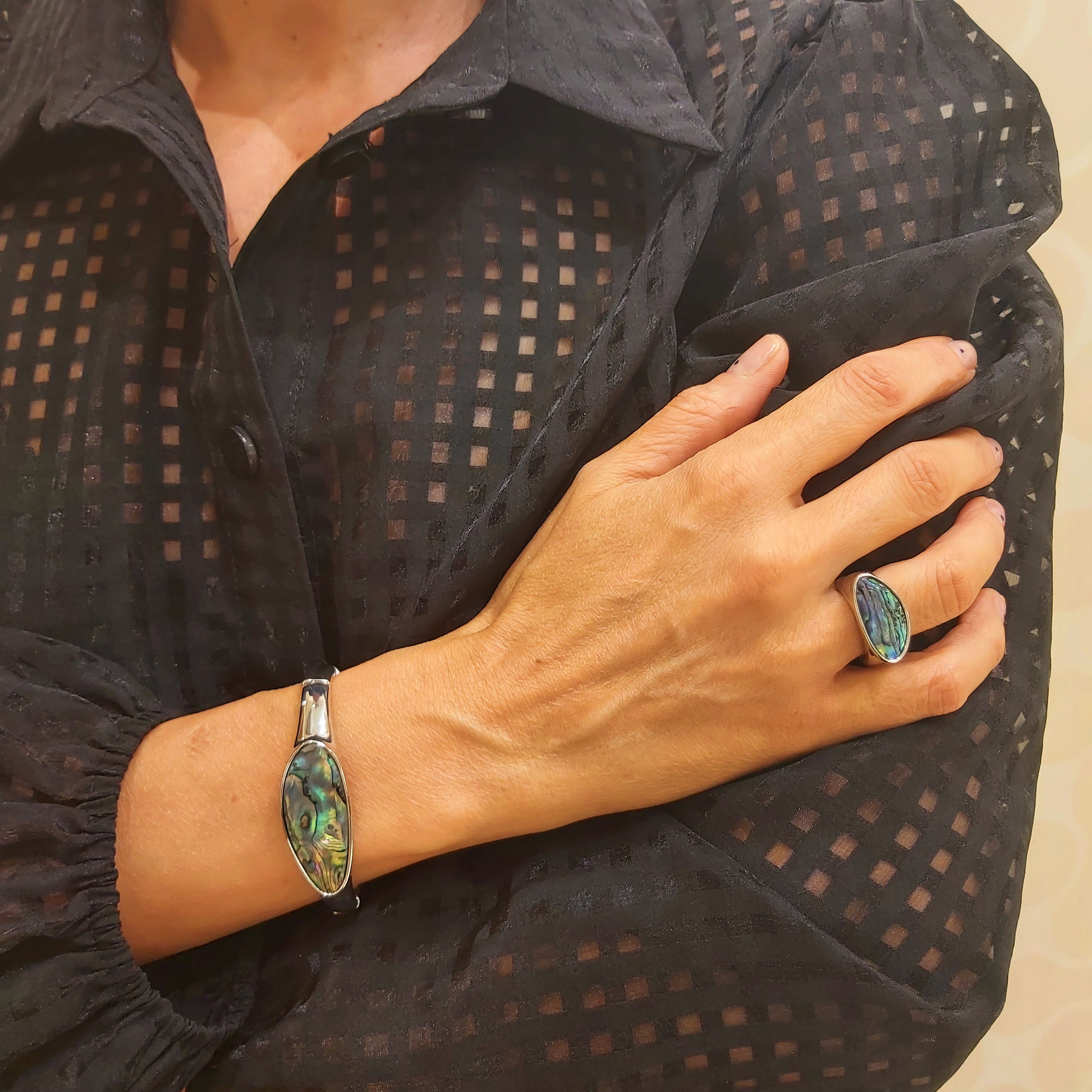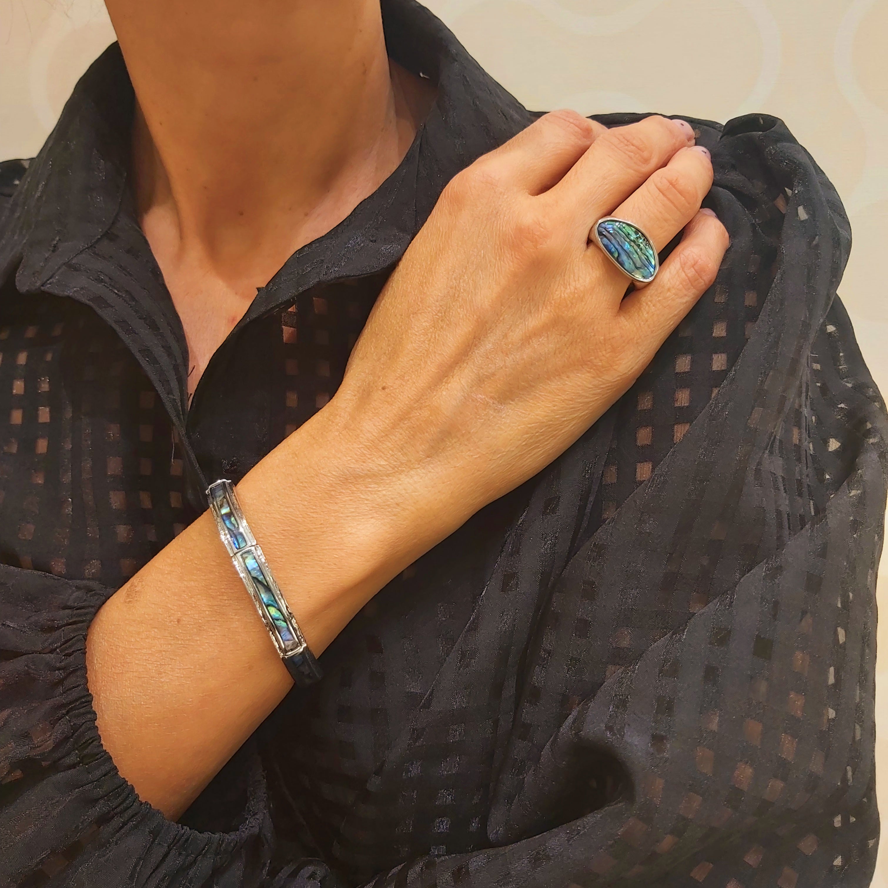 Ten pierścionek od razu przyciąga uwagę dzięki pięknie wypolerowanej muszli abalone, która mieni się turkusem, zielenią, granatem i delikatnym fioletem. Każdy egzemplarz ma swój unikatowy wzór.