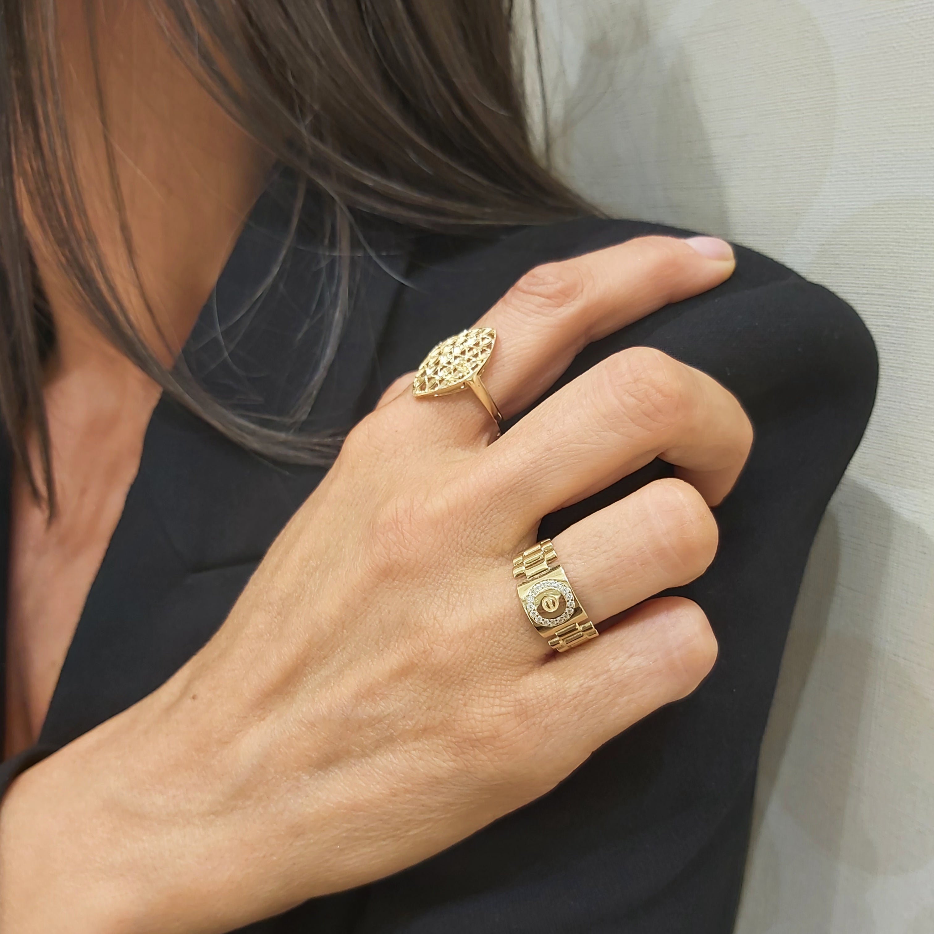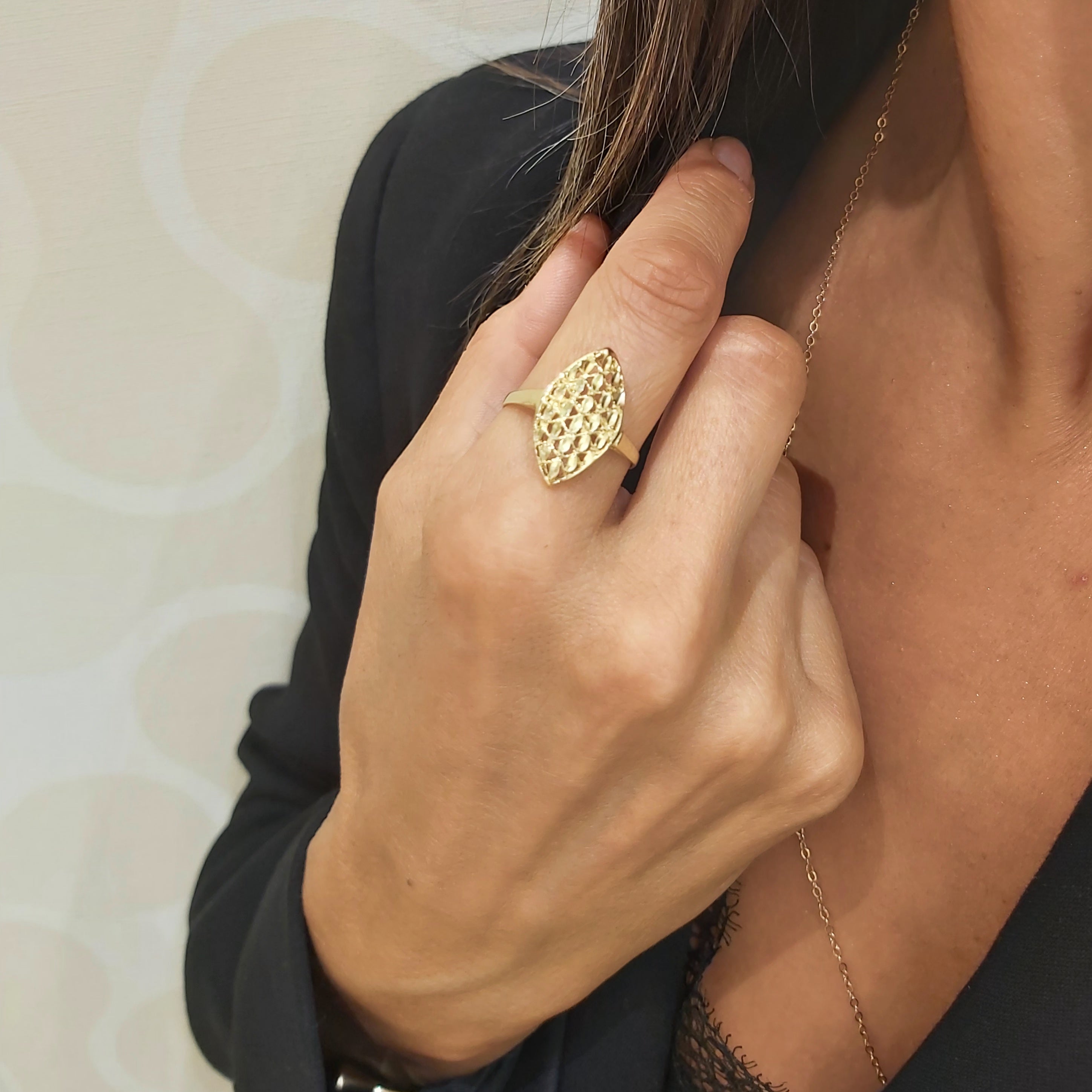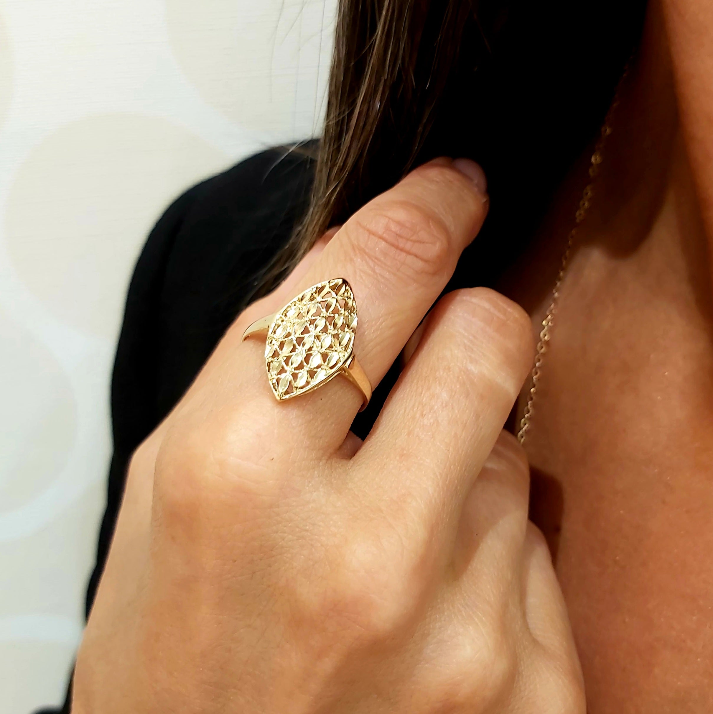 Elegancki pierścionek wykonany z wysokiej jakości złota próby 585. Jego wyjątkowy, ażurowy motyw w kształcie migdała przyciąga uwagę subtelną grą światła i cieni, nadając biżuterii lekkości i nowoczesnego charakteru. Geometryczna faktura sprawia, że pierścionek pięknie mieni się przy każdym ruchu dłoni.