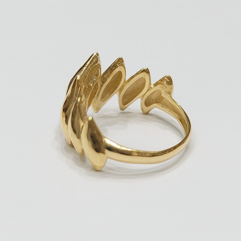 Nowoczesny pierścionek wykonany z wysokiej jakości złota próby 585. Nietuzinkowy design złożony z wypukłych elementów w kształcie płomieni,  o lśniącej i młotkowanej fakturze sprawia, że biżuteria przyciąga spojrzenia i stanowi wyjątkowy dodatek do każdej stylizacji.