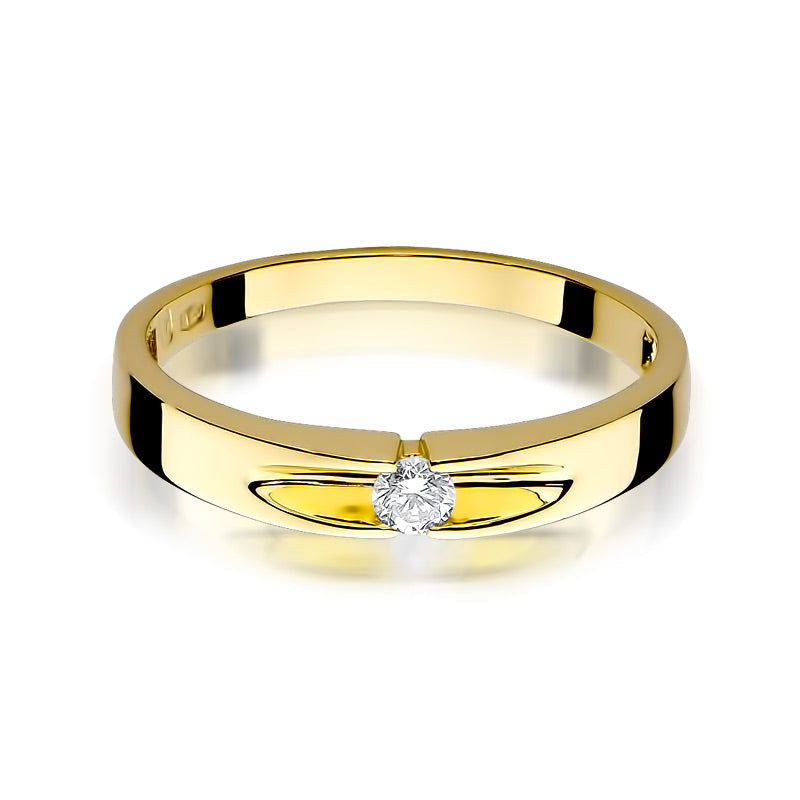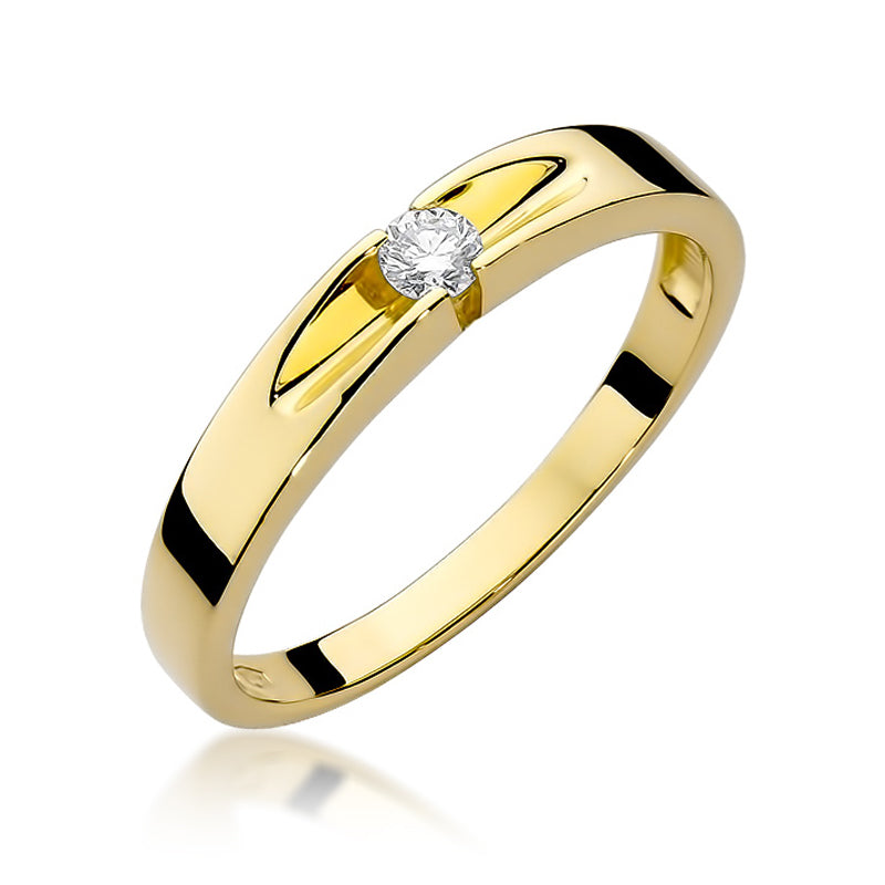 Pierścionek zaręczynowy wykonany ze złota próby 585. Model posiada w centralnym miejscu jeden większy diament oraz 2 mniejsze po obu stronach szyny pierścionka. Diamenty o szlifie brylantowym, okrągłym.