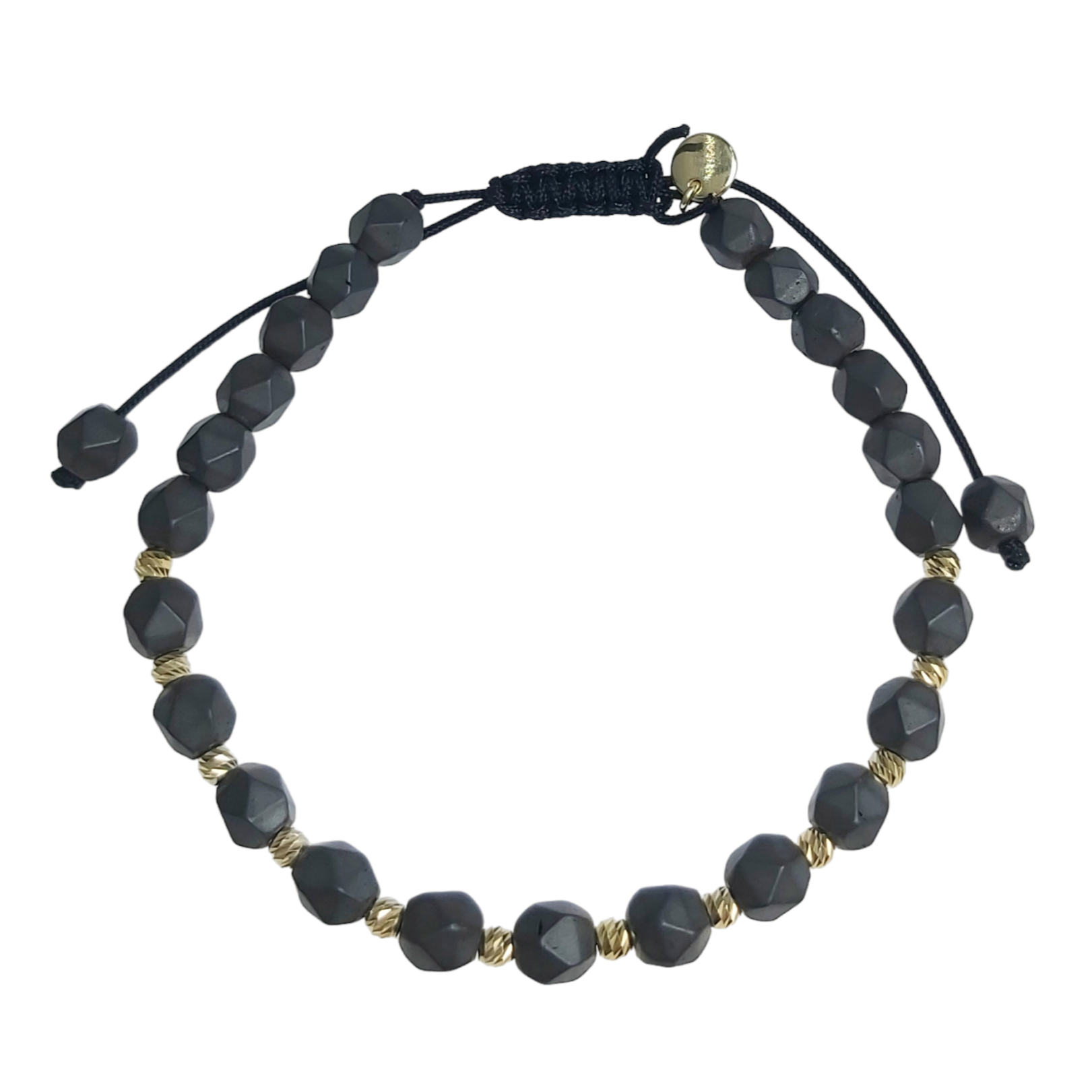 Bransoletka na czarnym sznurku z hematytem w kolorze grafitowym, oraz fasetowanymi kuleczkami, wykonana ze złoconego srebra próby 0,925.