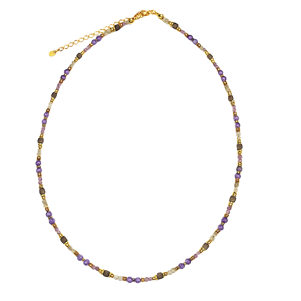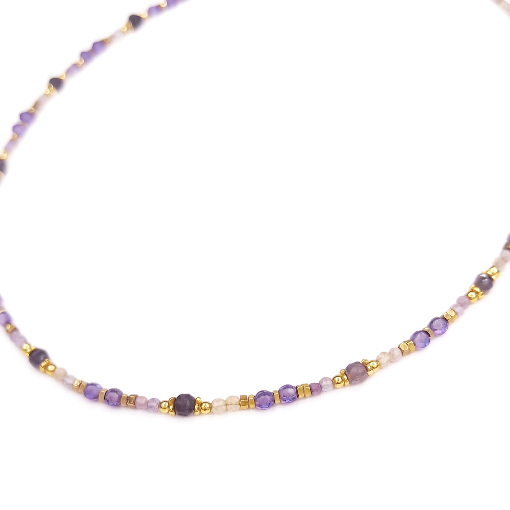 Naszyjnik wykonany z fasetowanych kulek turmalinu, turkusu i akwamarynu  o średnicy 3-4 mm. Złocone elementy wykonane zostały ze srebra próby 925.