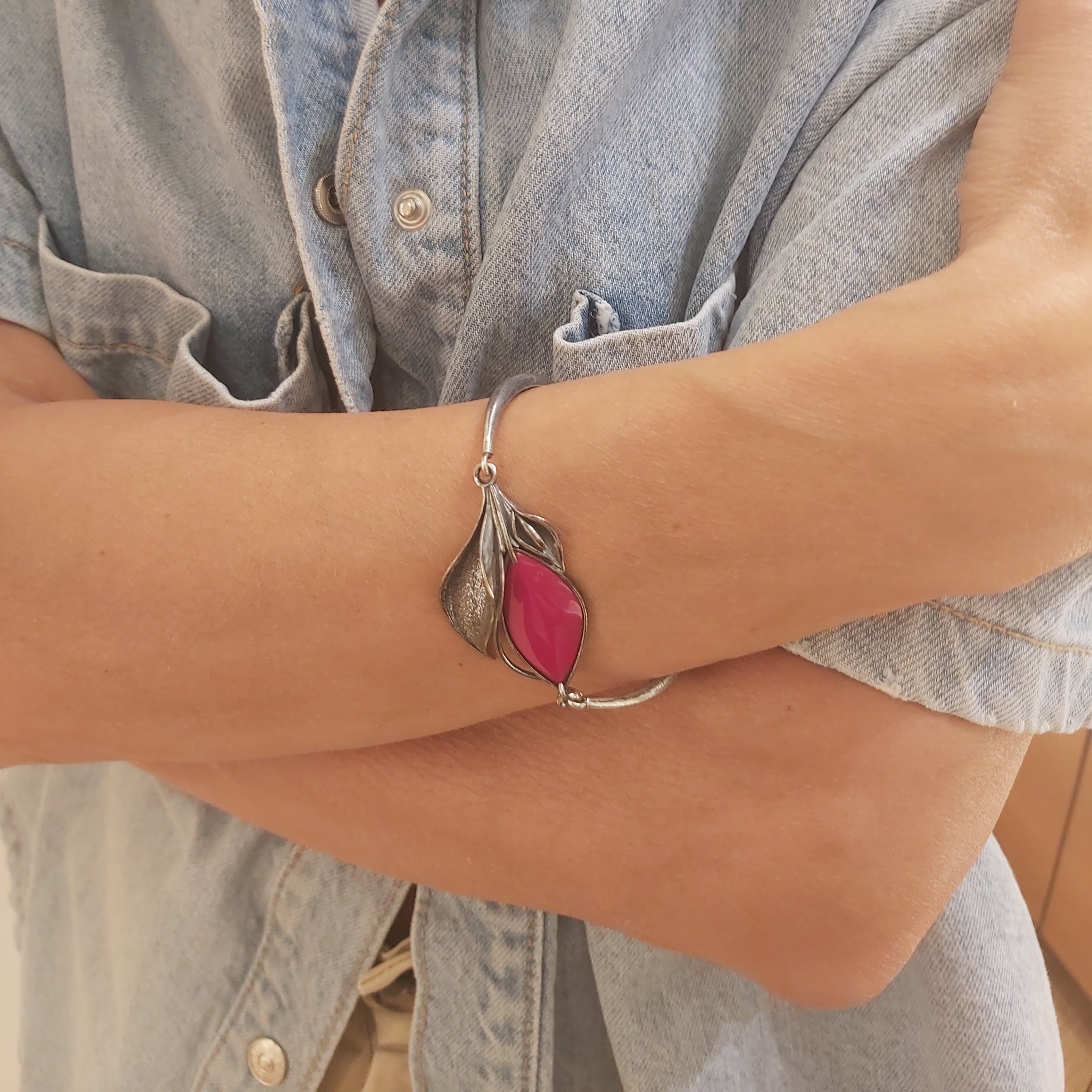 Bransoletka sztywna z czerwonym kwarcem, wykonana ze srebra próby 925.