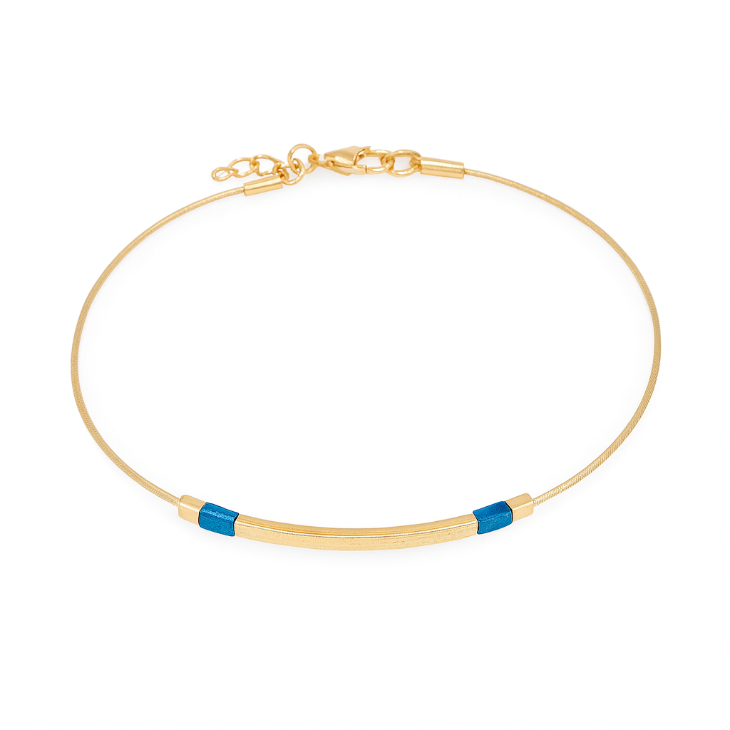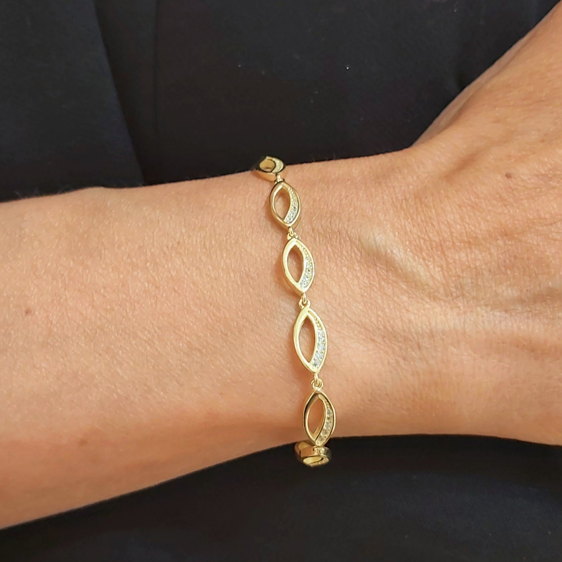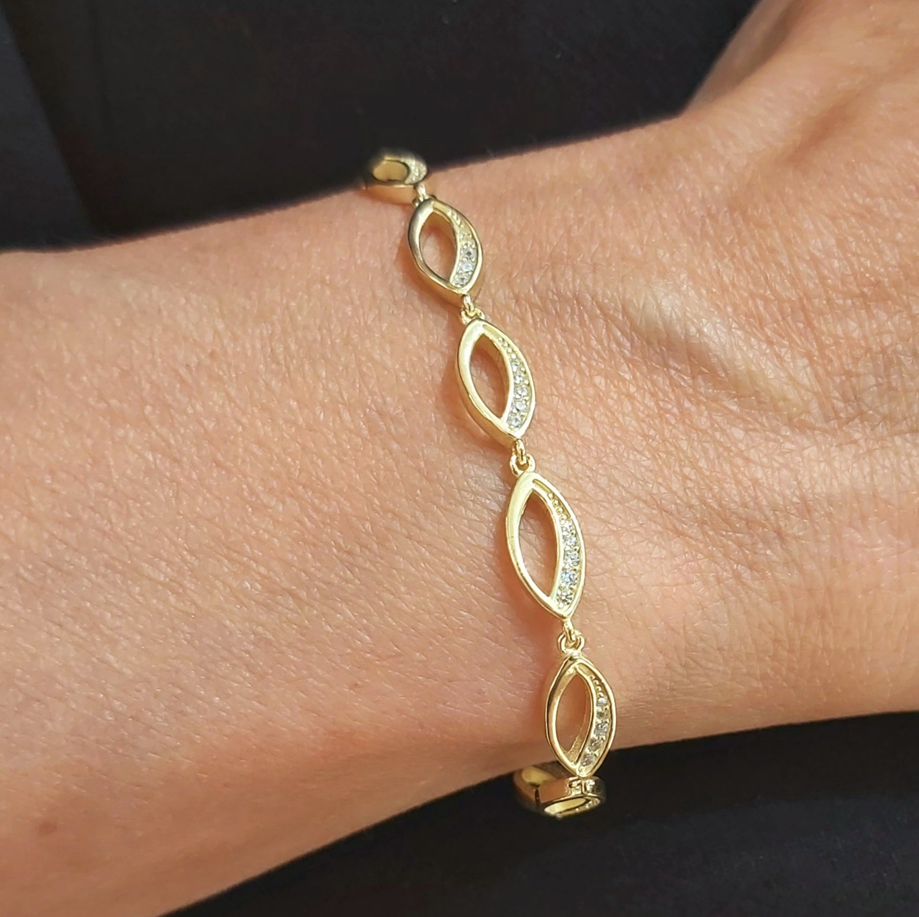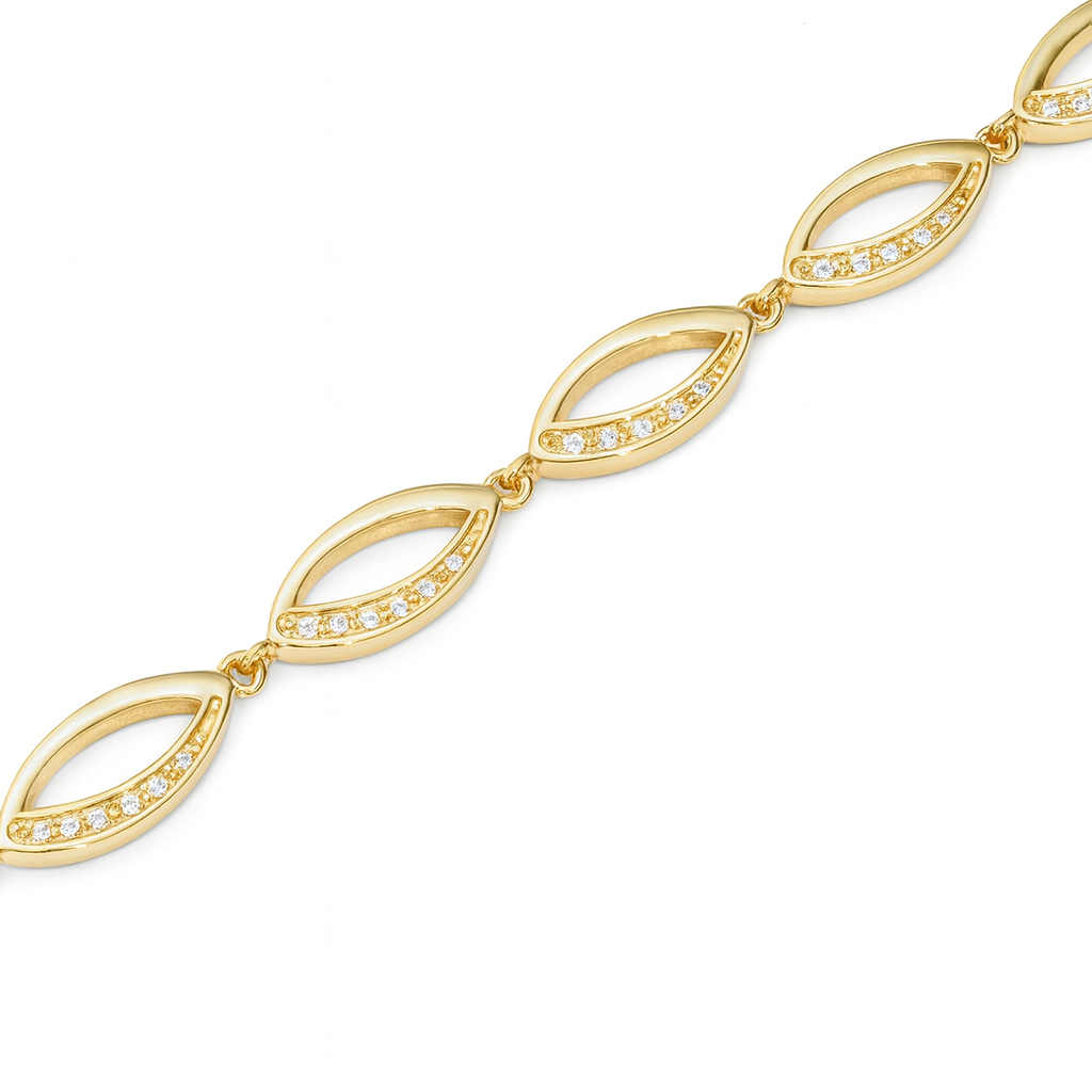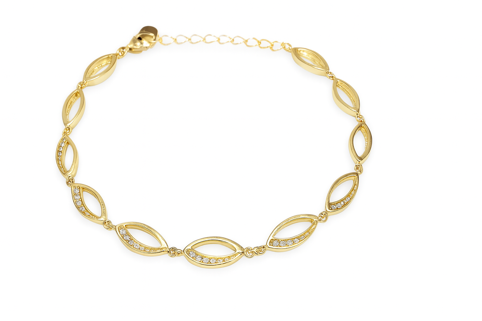 Bransoletka z elementami w kształcie łezki z cyrkoniami została wykonana ze srebra złoconego próby 925.