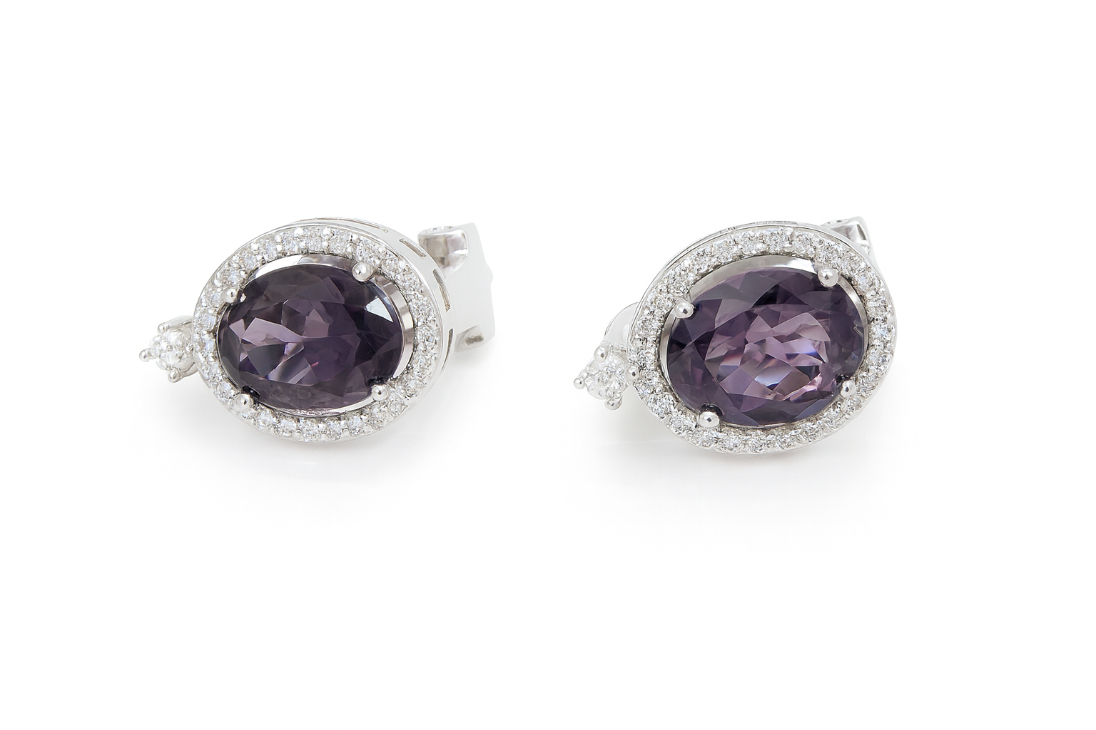 Stylowe srebrne klipsy ozdobione owalnym kamieniem w głębokim, fioletowym odcieniu. Centralny kamień otacza delikatny wianuszek połyskujących cyrkonii, które pięknie odbijają światło i podkreślają jego kolor. Całość wykonana ze srebra próby 925, rodowanego – odpornego na ciemnienie i zachowującego blask przez lata.