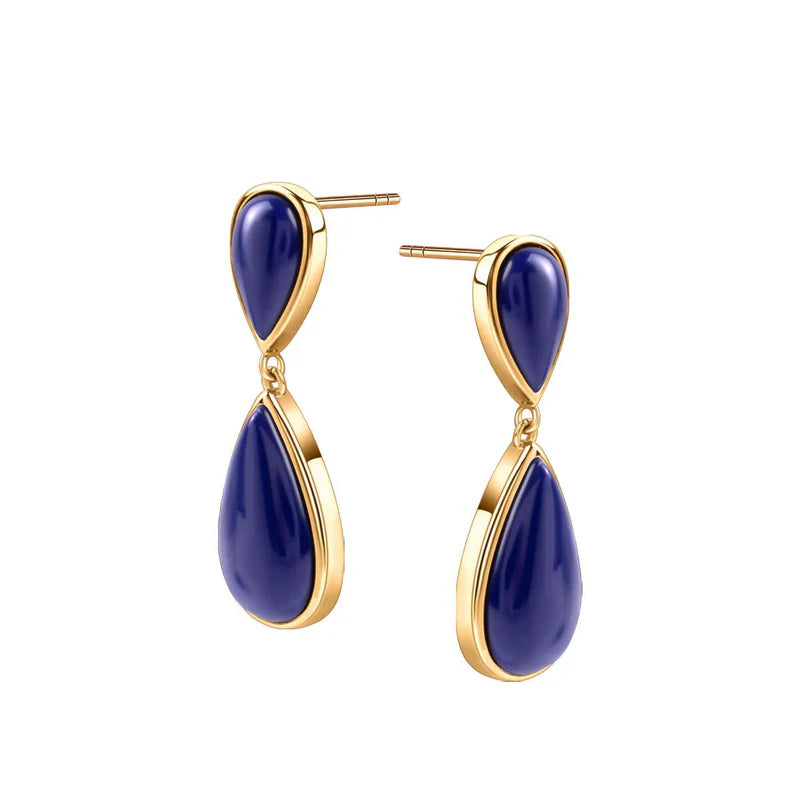 Te kolczyki to klasyka w nowoczesnym, bardzo szykownym wydaniu. Wykonane ze srebra próby 925 i pokryte złotem, zachwycają dwoma kamieniami lapis lazuli w kształcie kropli, które tworzą smukłą, efektowną linię. Głęboki fiolet kamienia dodaje biżuterii tajemniczości i luksusowego charakteru, a złota oprawa pięknie ociepla całość.