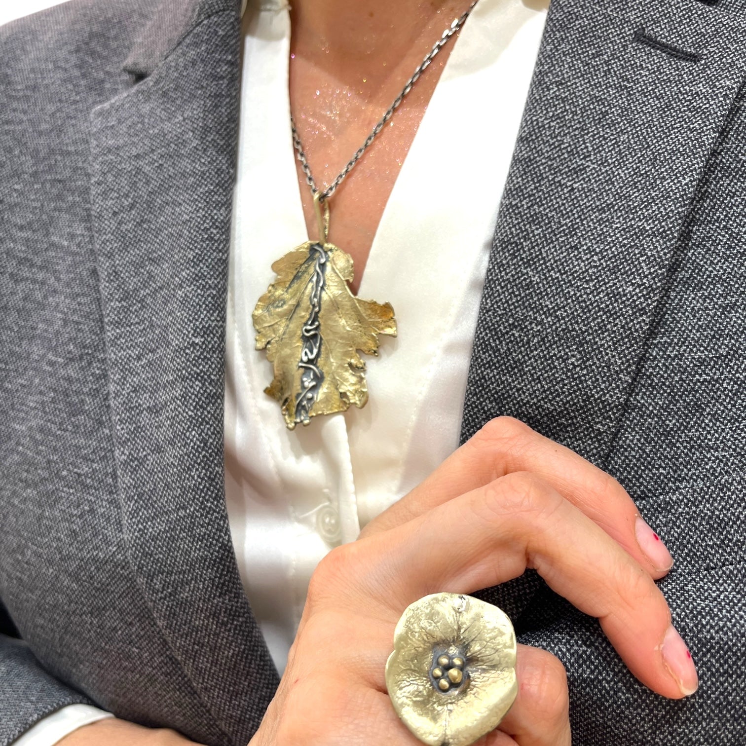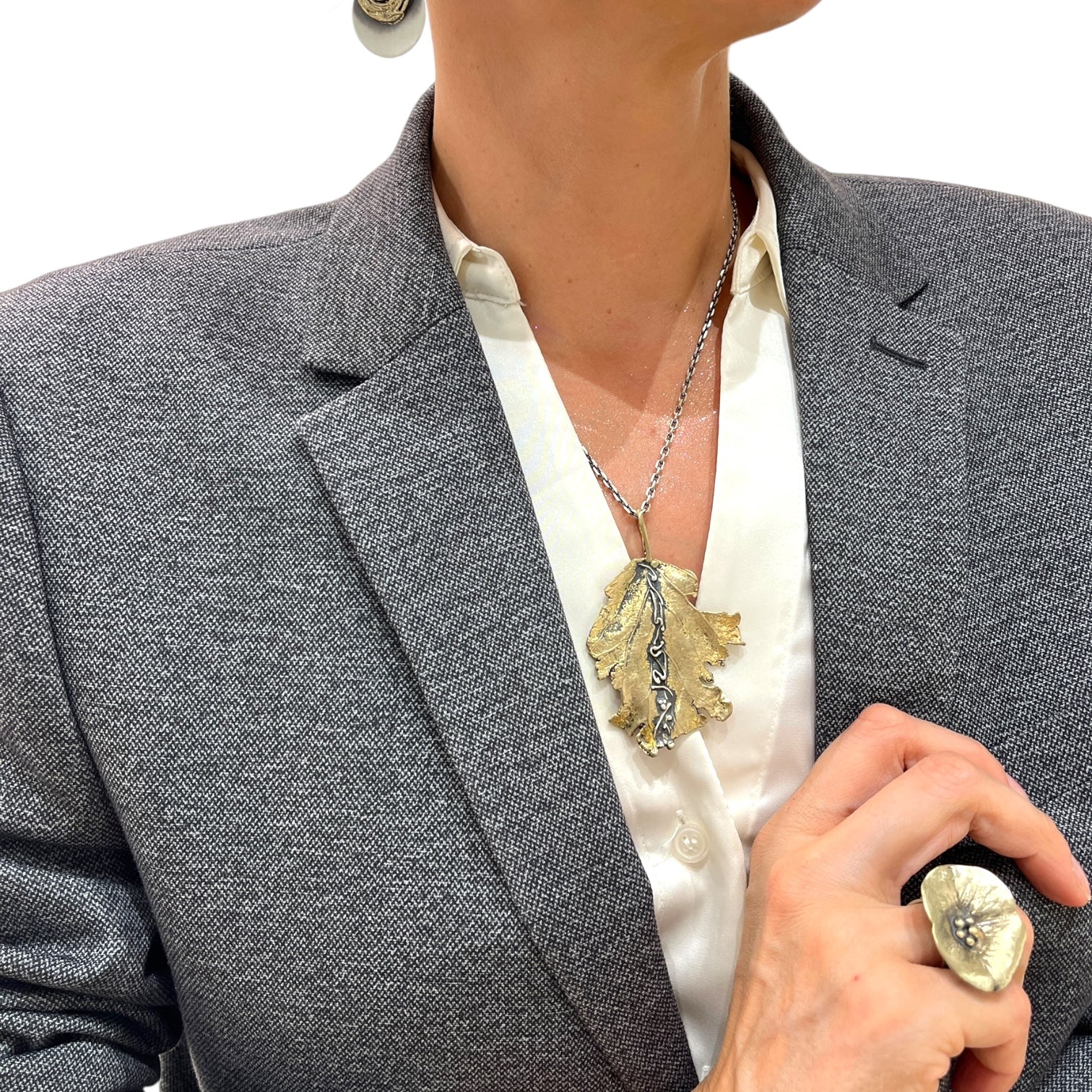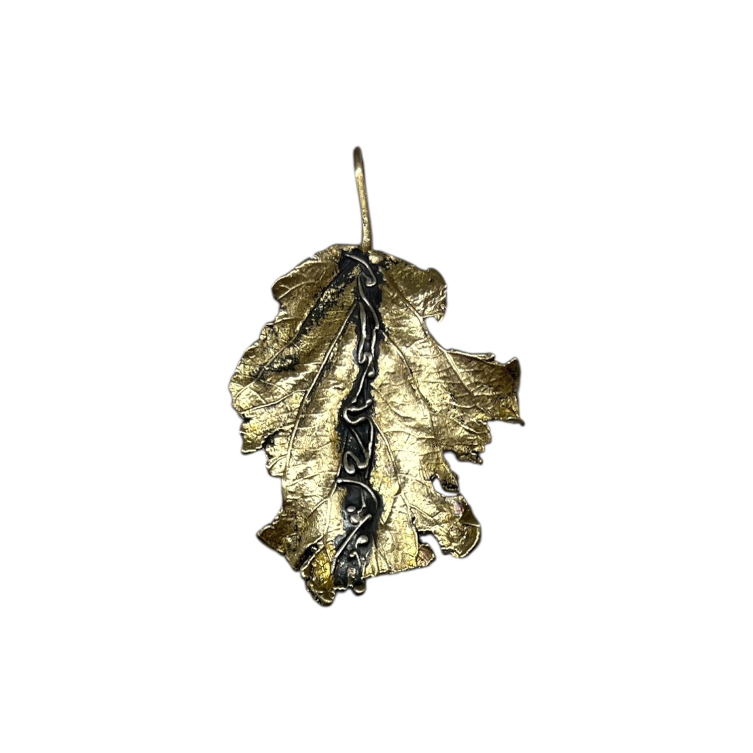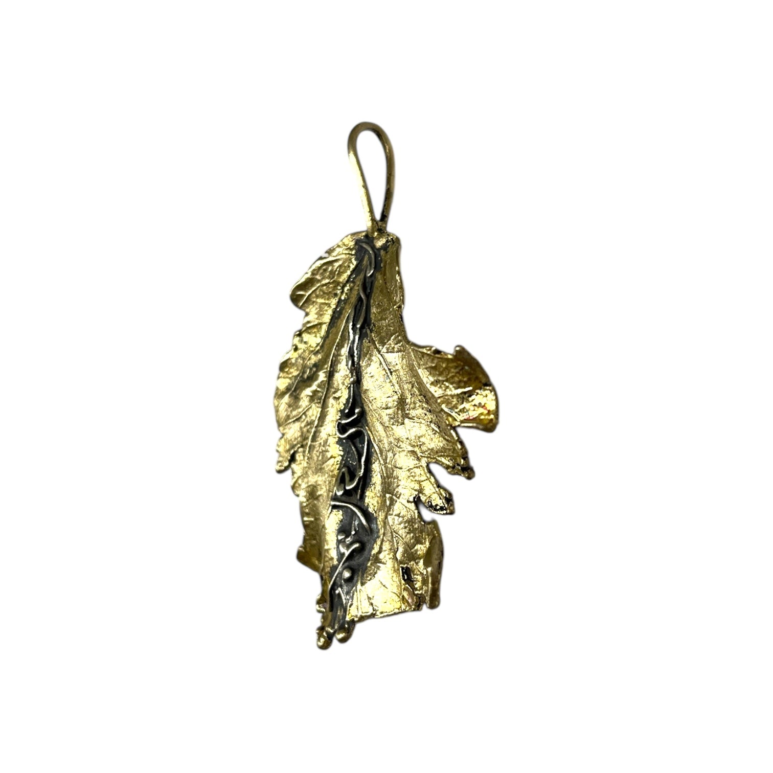 Zawieszka w kształcie liścia, ręcznie wykonana z oksydowanego srebra próby 925. Złocenie wykonane zostało mosiądzem.