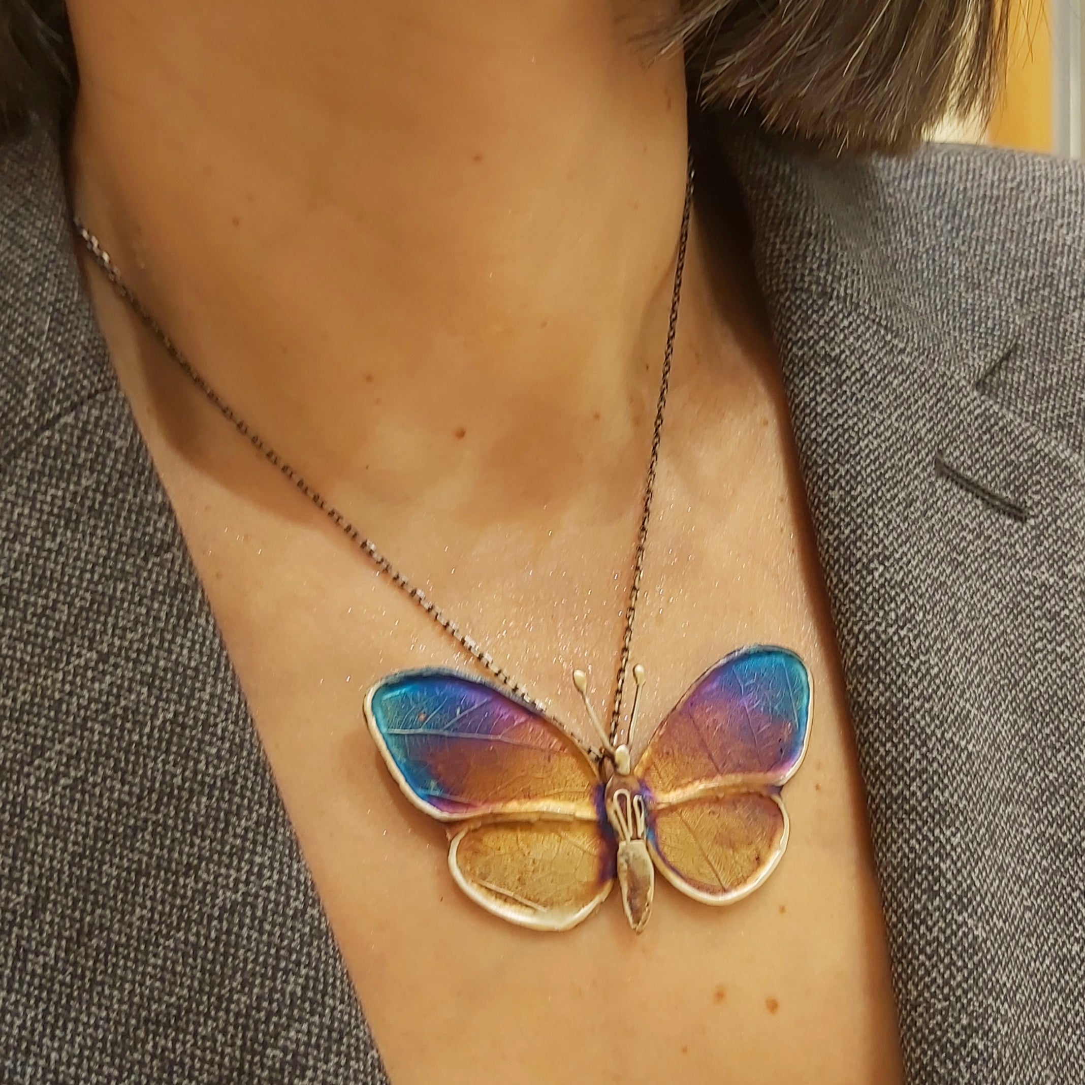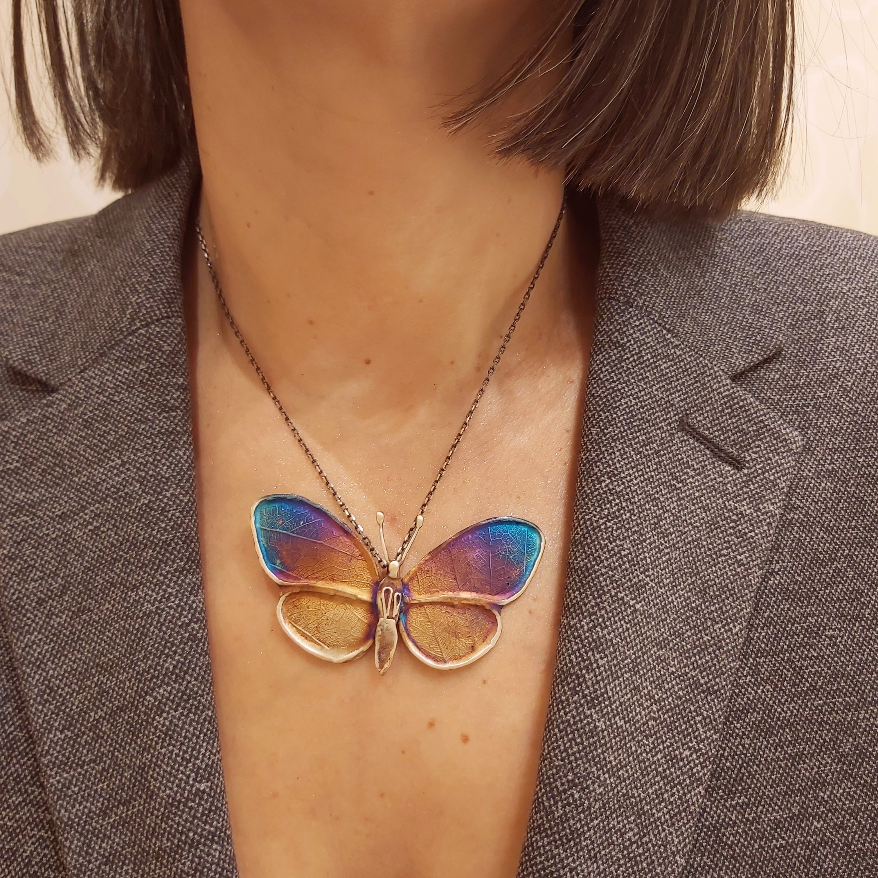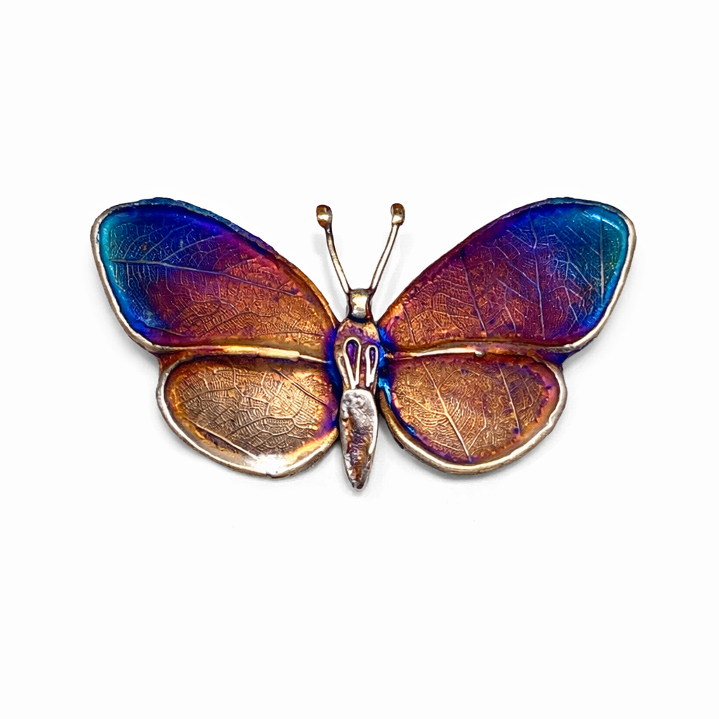Broszka w kształcie motyla, zaprojektowana i ręcznie wykonana przez artystę Doriana Grabowskiego. Artystyczna galwanizacja nadaje unikalny, wielokolorowy efekt na całej powierzchni broszki. To wyjątkowa i oryginalna ozdoba, która podkreśla kunszt rękodzielnictwa. Idealna dla osób ceniących unikalną biżuterię z charakterem.