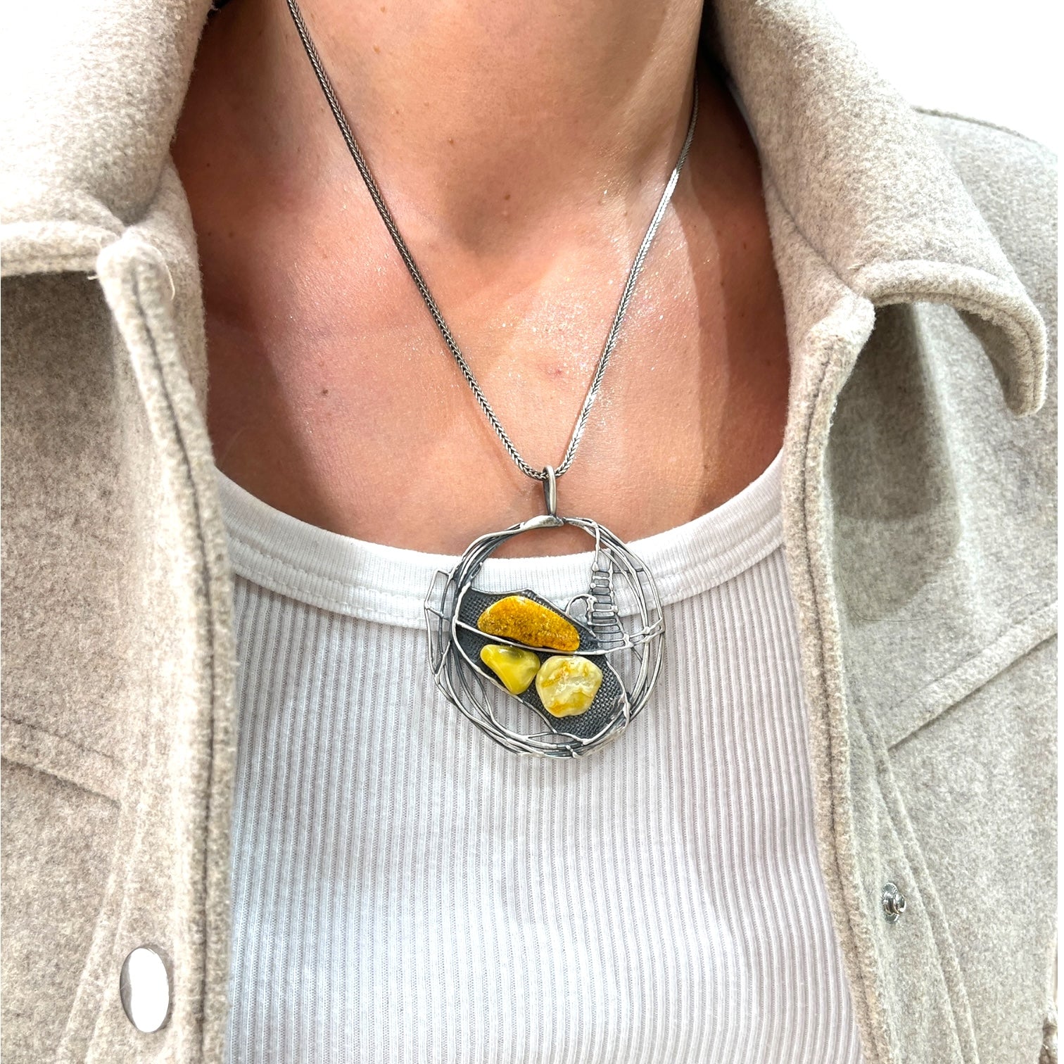 Przedstawiamy oryginalną zawieszkę autorstwa Dorian Grabowski, polskiego artysty znanego z ręcznie wykonywanej biżuterii artystycznej. Zawieszka wykonana została z oksydowanego srebra próby 925 i zdobiona naturalnymi bursztynami o zróżnicowanych barwach – od mlecznego po koniakowy.