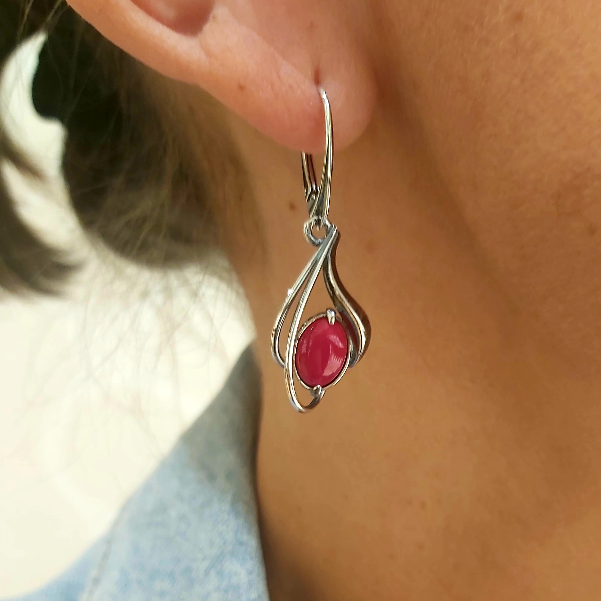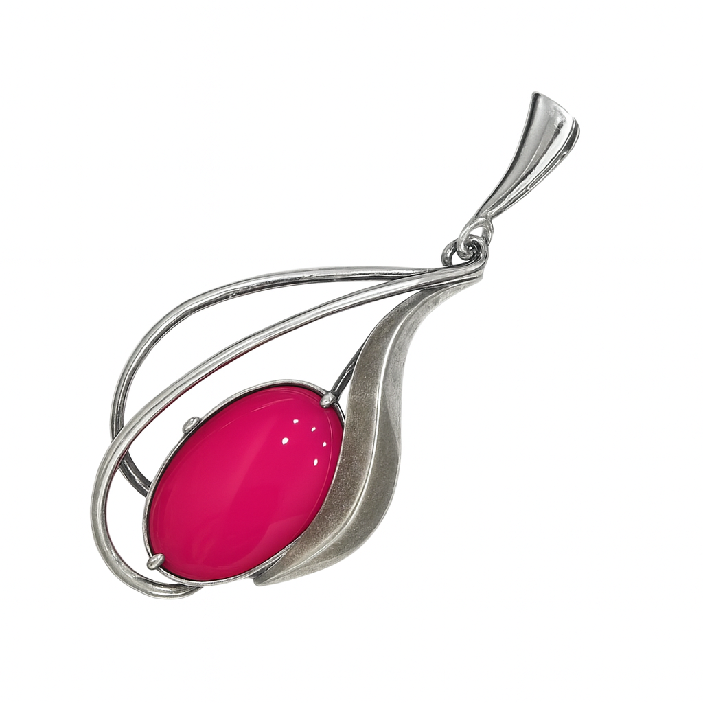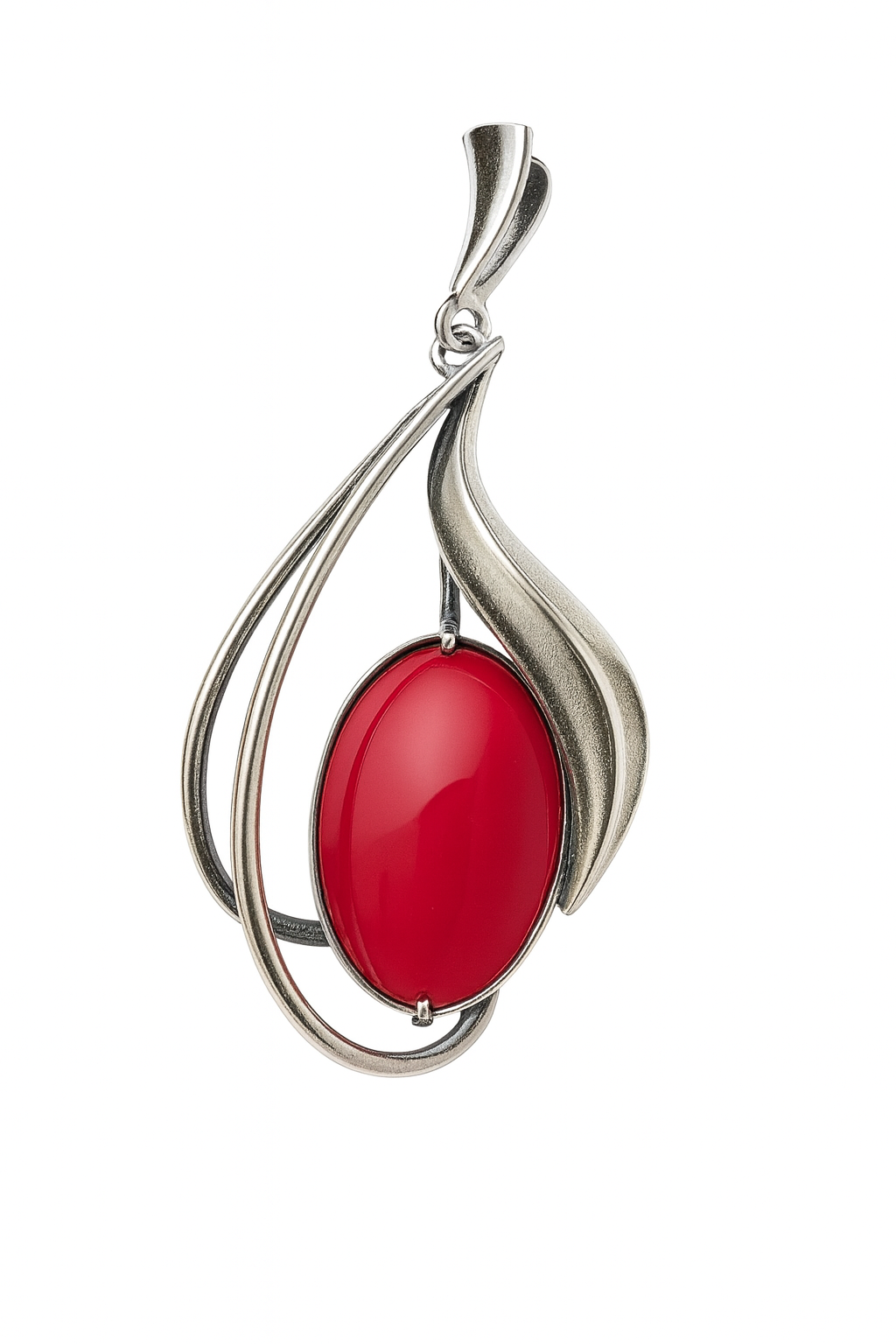 Elegancka zawieszka wykonana ze srebra próby 925 z naturalnym kwarcem w intensywnym, czerwonym kolorze. Owalny kamień osadzony jest w finezyjnej oprawie o falistych liniach, które nadają biżuterii lekkości i nowoczesnego charakteru.