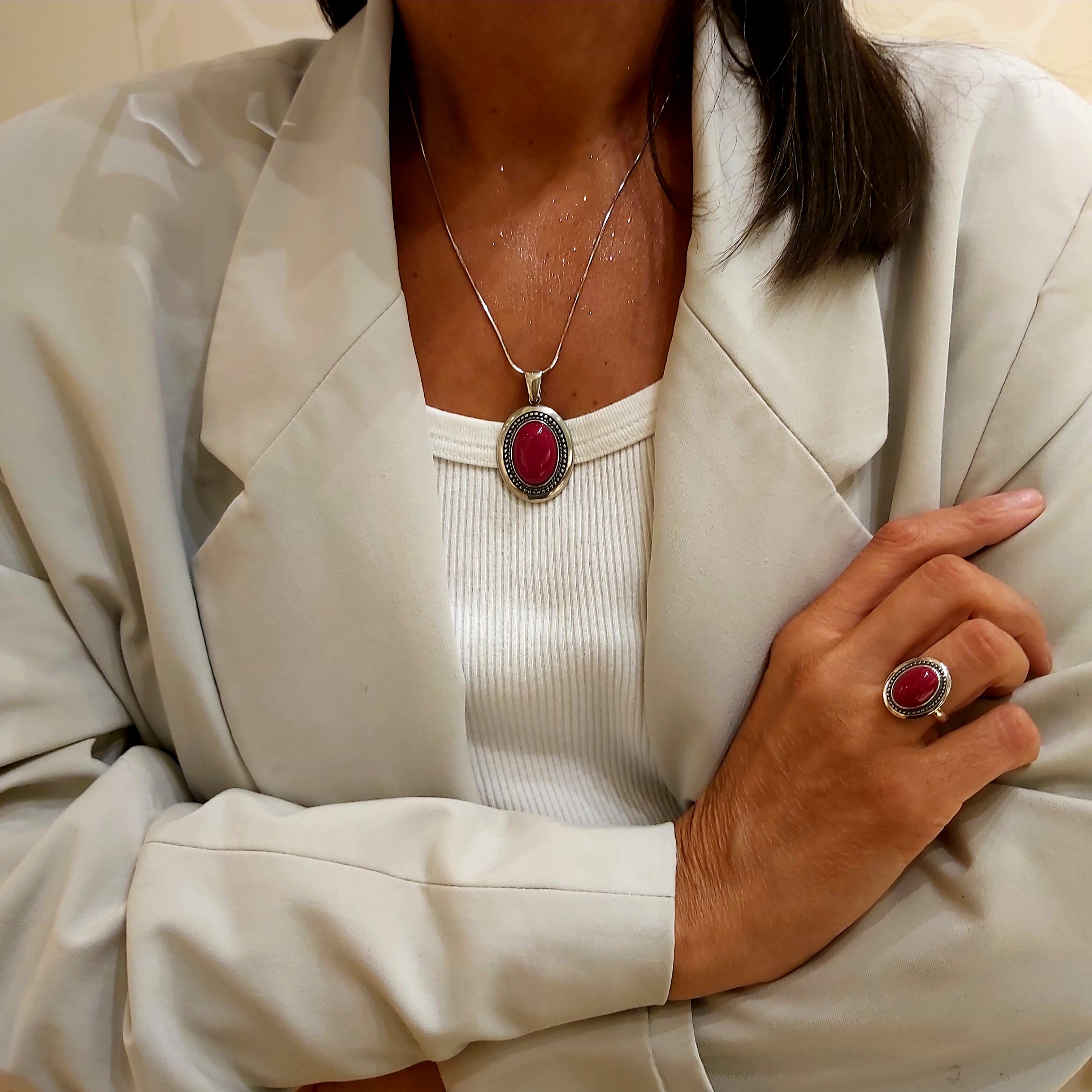 Elegancka srebrna zawieszka wykonana ze srebra próby 925. Centralnym elementem biżuterii jest naturalny koral w intensywnym czerwonym odcieniu, ujęty w ozdobną oprawę z delikatnym zdobieniem. Zawieszka dodaje wyrazistości każdej stylizacji, podkreślając kobiecy charakter i naturalne piękno. Idealna na co dzień oraz na specjalne okazje.