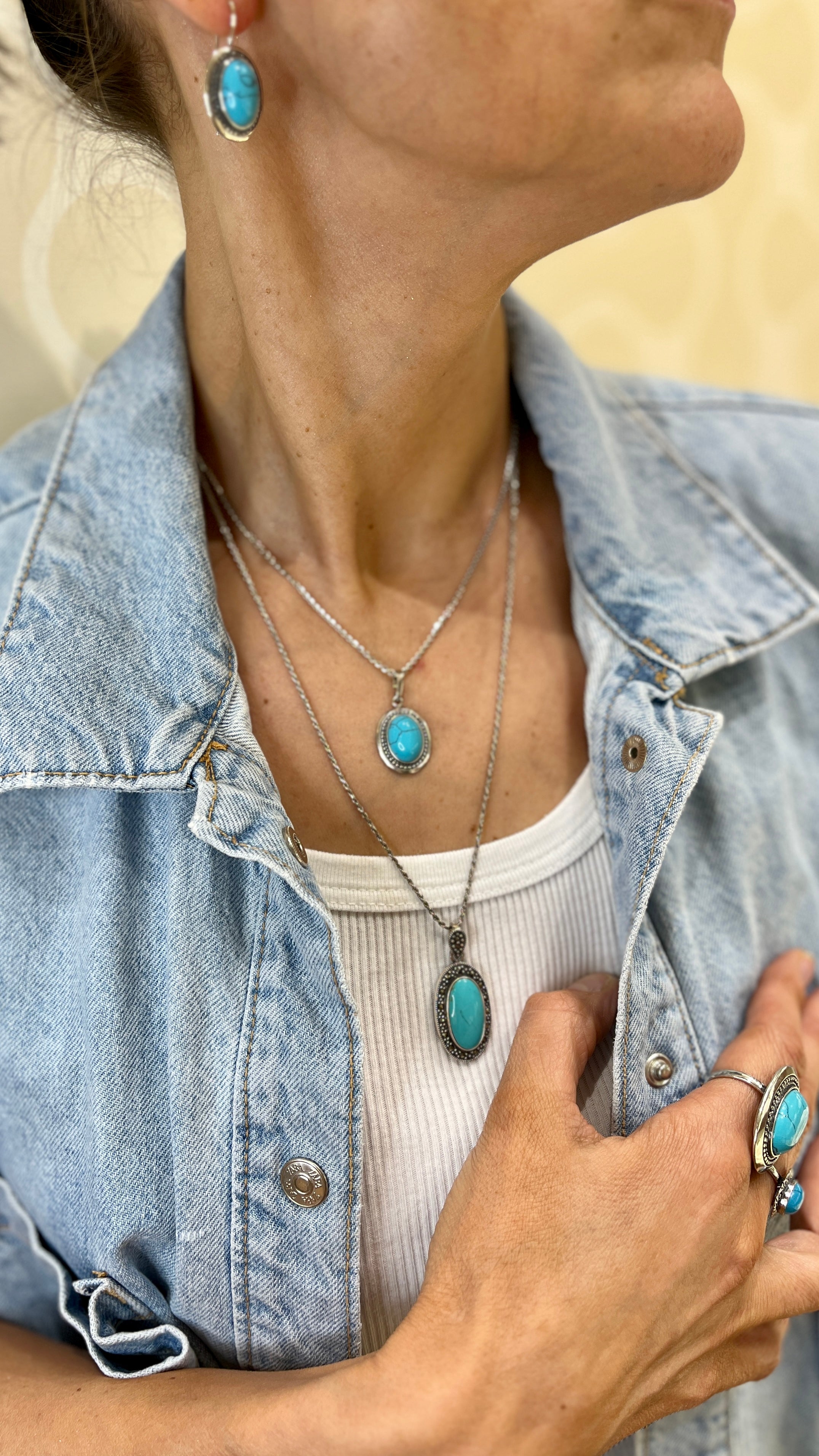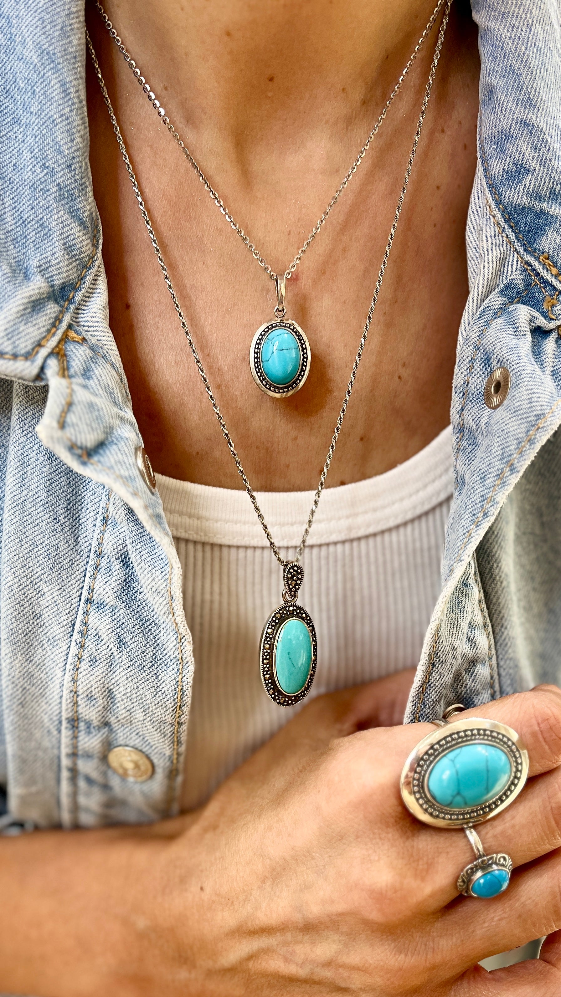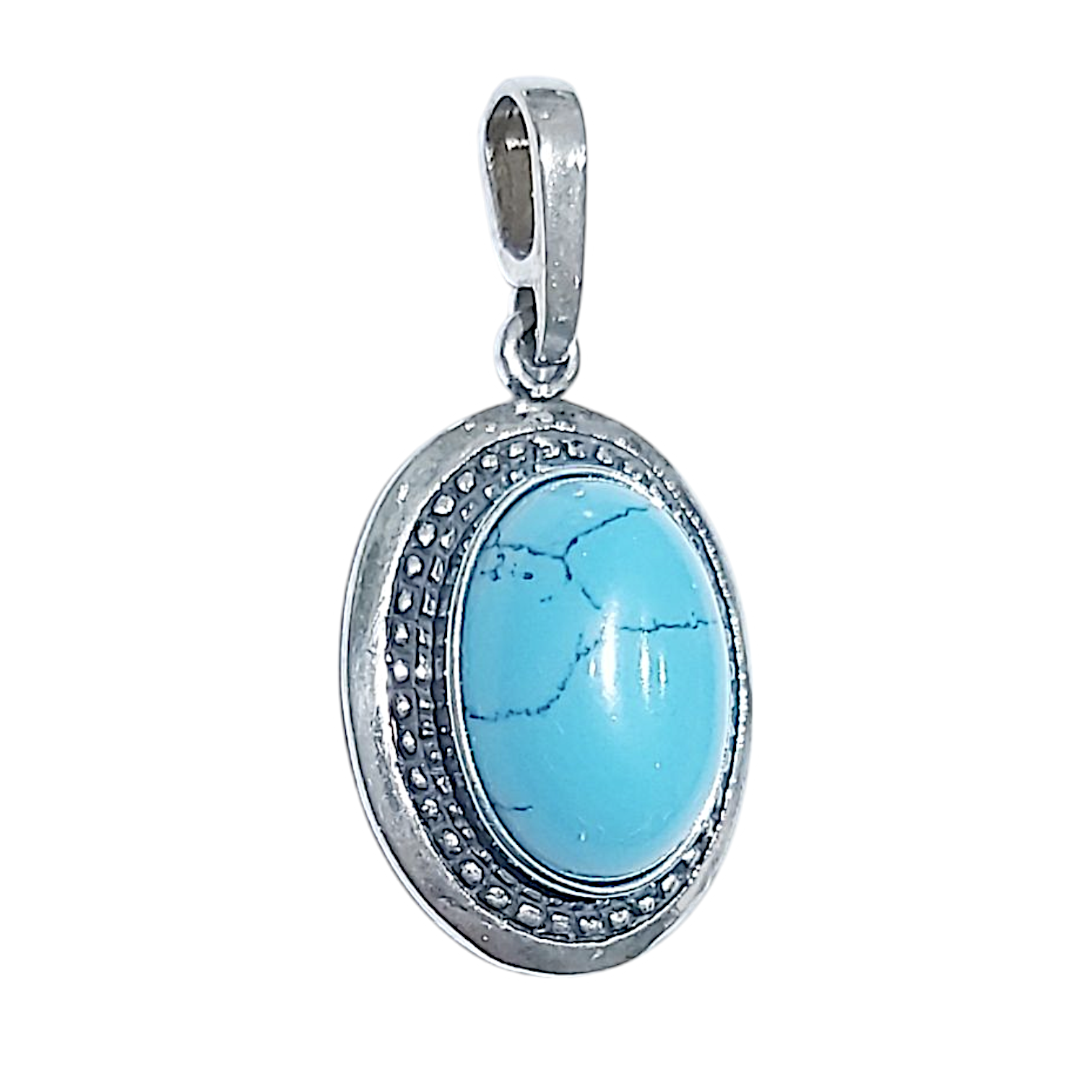 Klasyczna i elegancka zawieszka z naturalnym turkusem. Kamień o wyjątkowej, niepowtarzalnej barwie osadzony jest w ozdobnej ramce ze srebra próby 925, co nadaje zawieszce elegancki i ponadczasowy charakter.