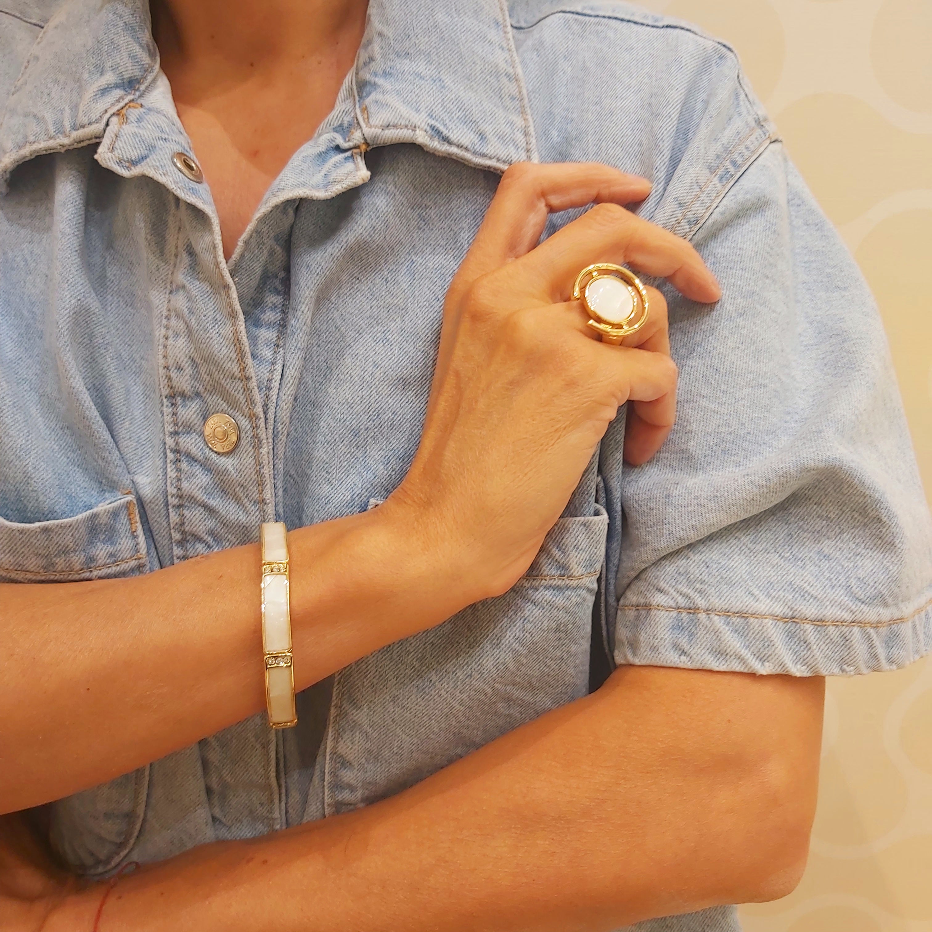 Ten pierścionek to idealny wybór, jeśli chcę dodać stylizacji czegoś odważnego i artystycznego. Wykonany ze stali szlachetnej w kolorze złotym, ozdobiony naturalną muszlą mleczną.