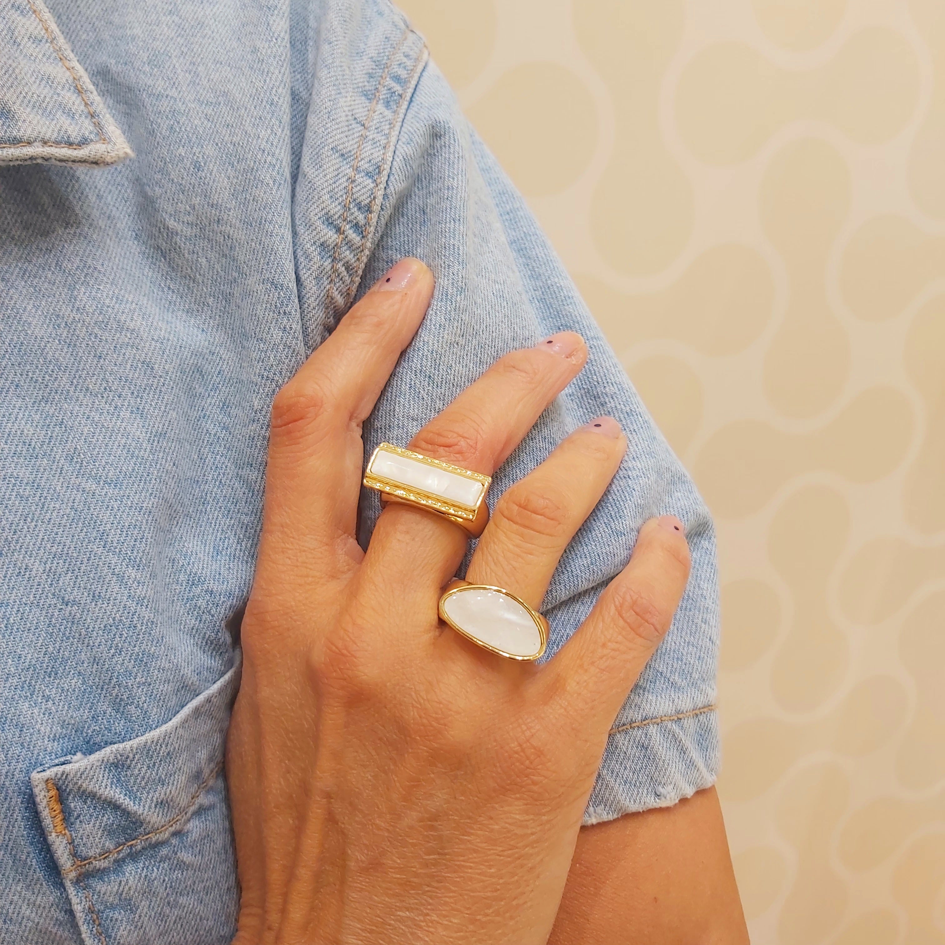 Ten pierścionek od razu przyciąga uwagę dzięki pięknie wypolerowanej muszli mlecznej. Każdy egzemplarz ma swój unikatowy wzór.