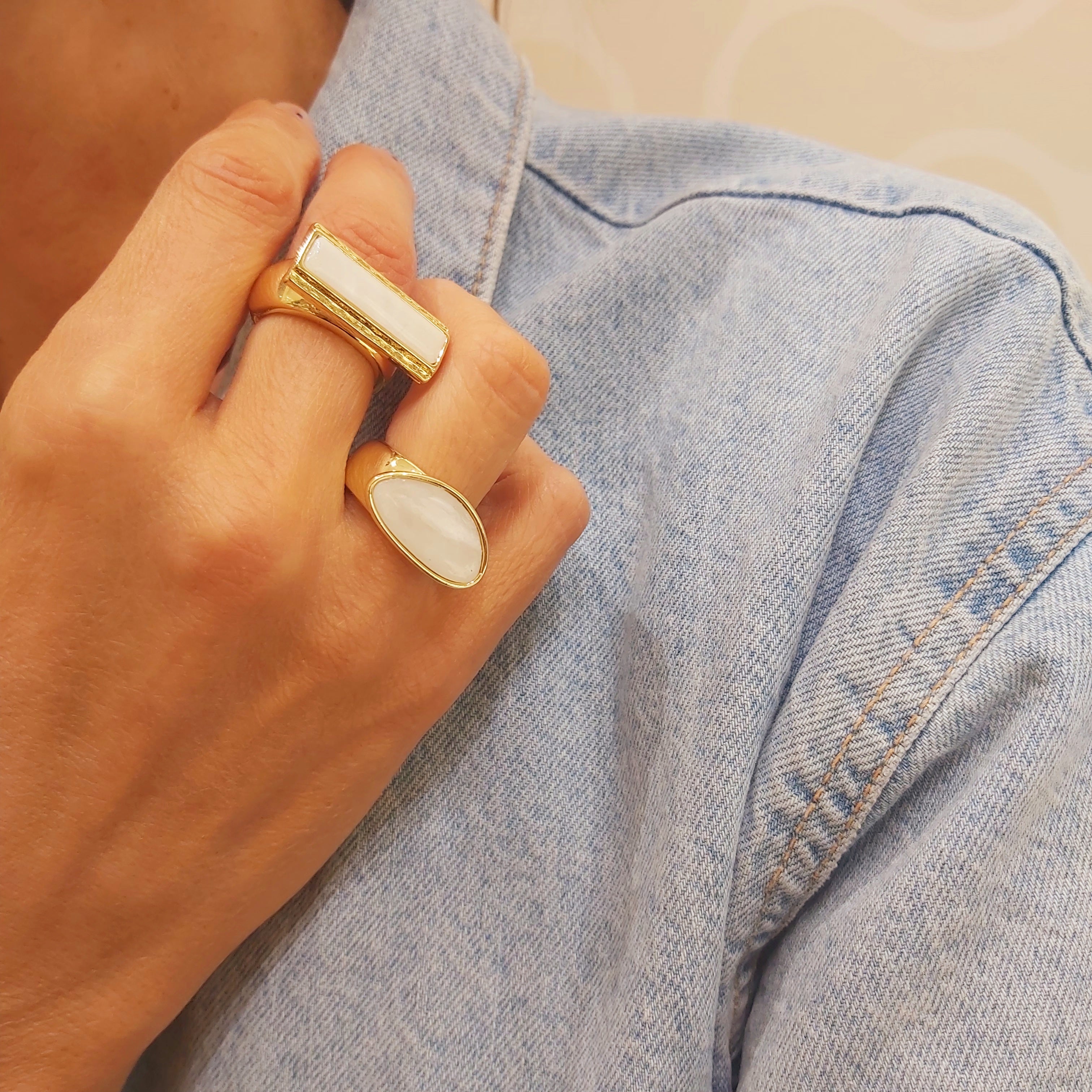 Złocony pierścionek ze stali szlachetnej z podłużną muszlą mleczną