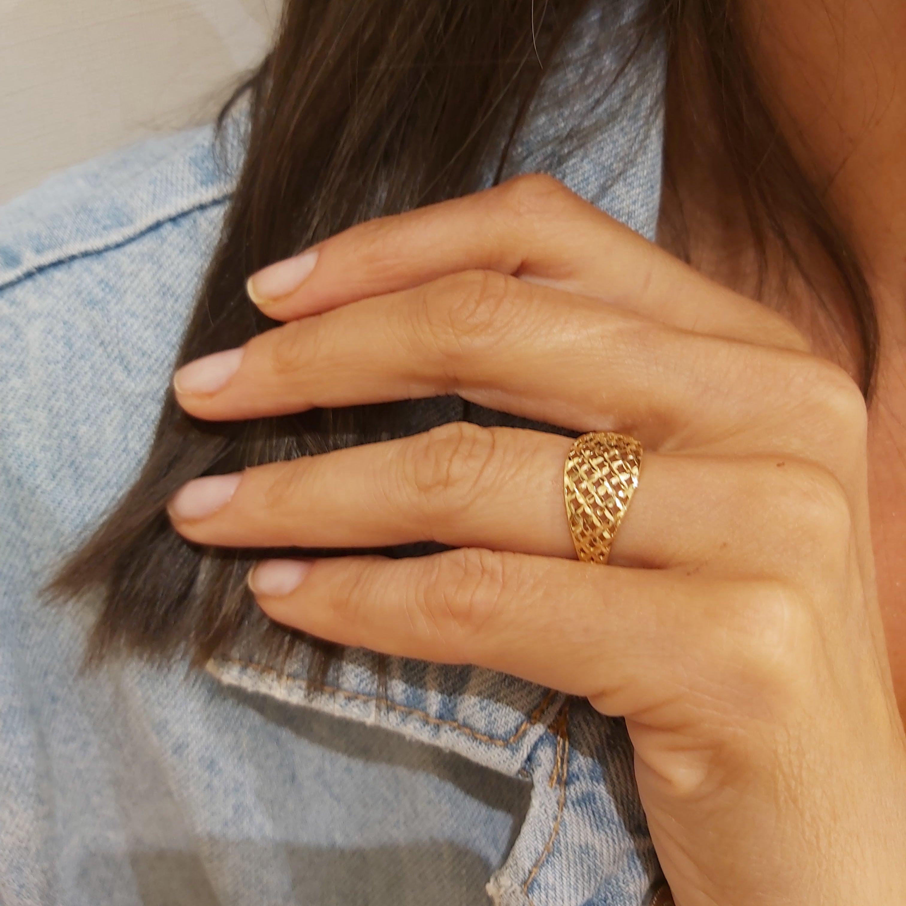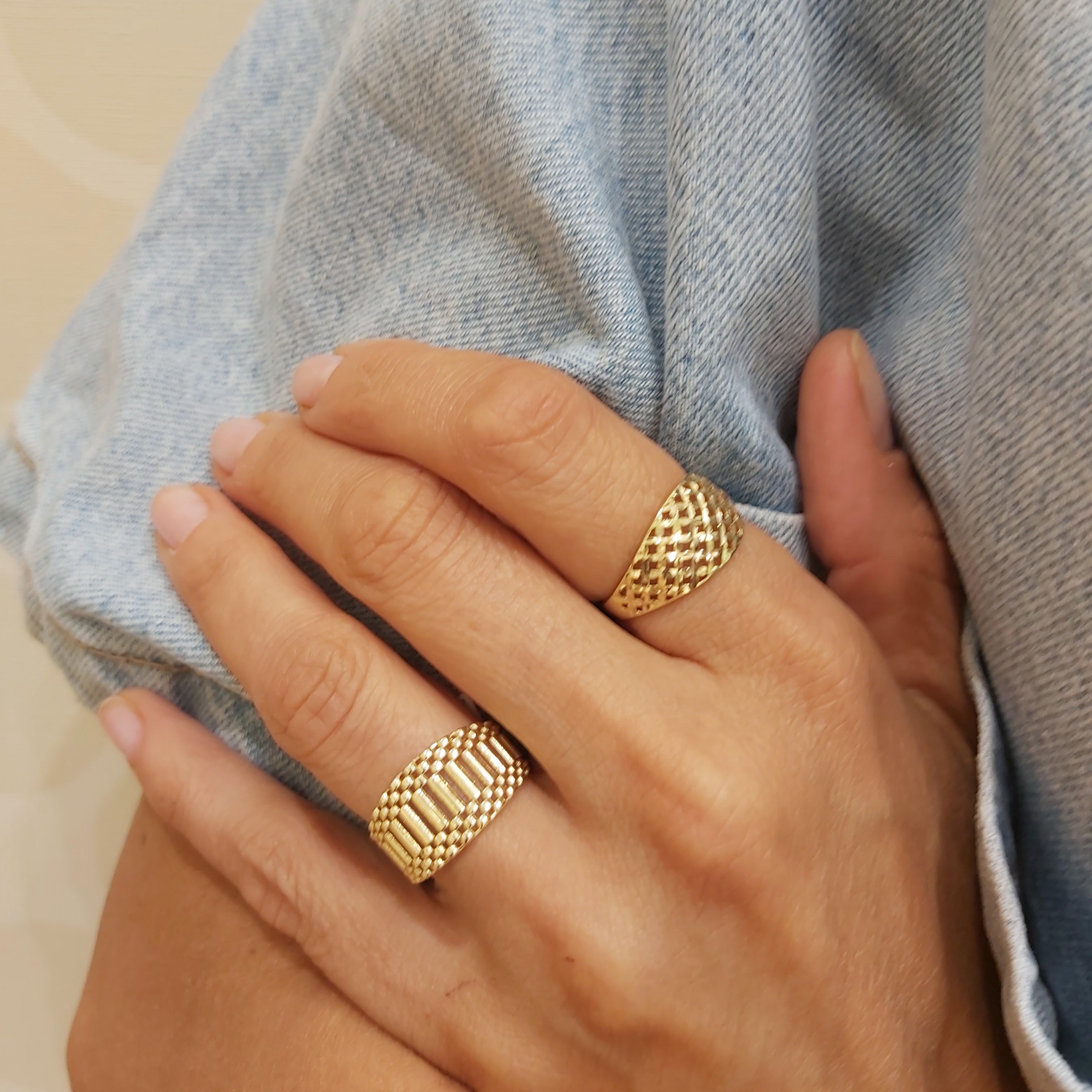 Złoty pierścionek jest połączeniem klasyki i aktualnych trendów jubilerskich, a jego minimalistyczny charakter podkreśla nietuzinkowy diamentowany wzór.