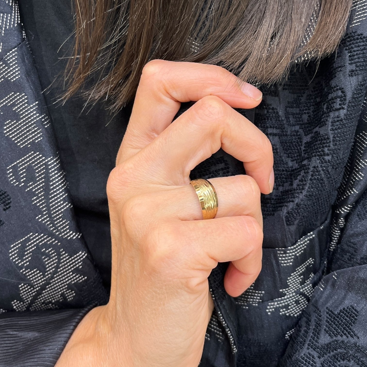 Pierścionek szeroki, frezowany, wykonany ze złota próby 333.