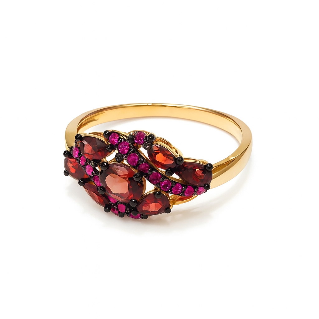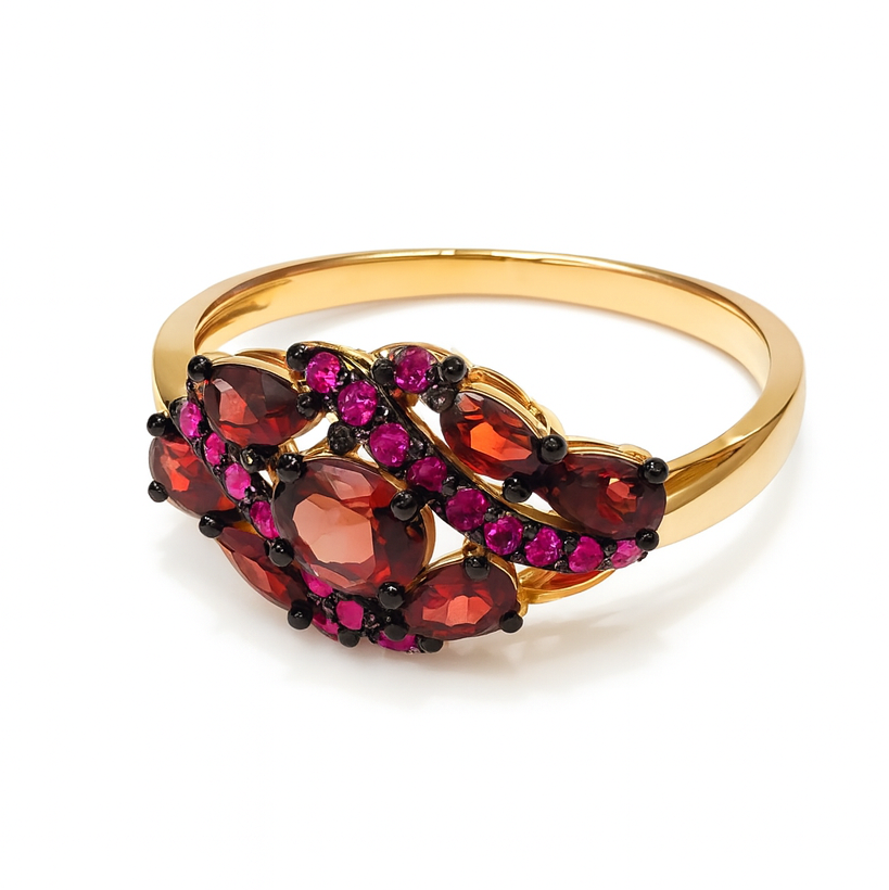 Zjawiskowy pierścionek wykonany ze złota próby 585, ozdobiony kompozycją naturalnych granatów i rubinów w intensywnych, szlachetnych odcieniach czerwieni. Kamienie tworzą efektowny, ażurowy wzór, który pięknie odbija światło i przyciąga wzrok. To idealna biżuteria dla kobiet, które kochają bogate kolory i luksusowe detale. Sprawdzi się zarówno na co dzień, jak i jako wyjątkowy prezent na szczególną okazję.